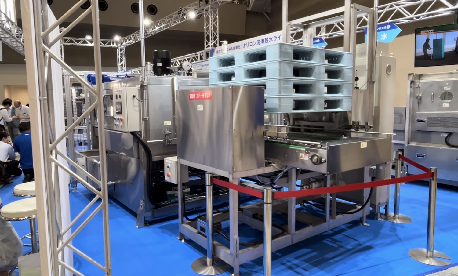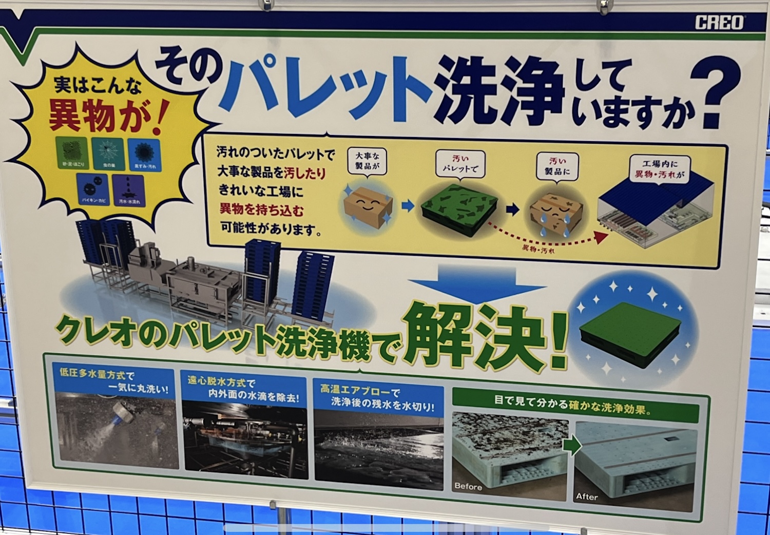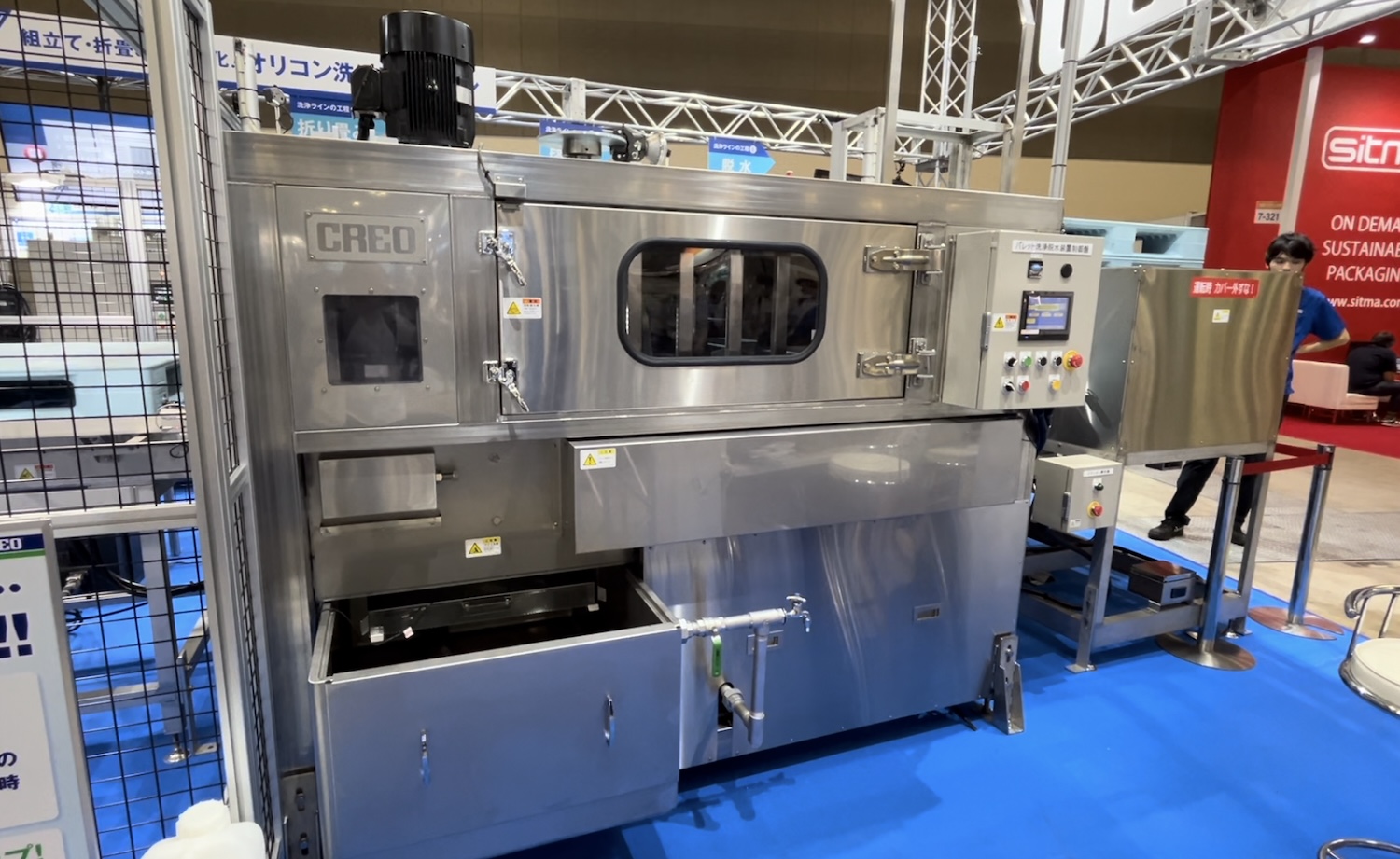 そして洗浄機メーカーのクレオもパレット洗浄機を出展していた。同社はオリコン(折りたたみコンテナボックス)の洗浄機から発展した洗浄機の専門メーカー。リースやレンタルのパレットを展開する企業に同社のパレット洗浄機は利用されているそうだ。