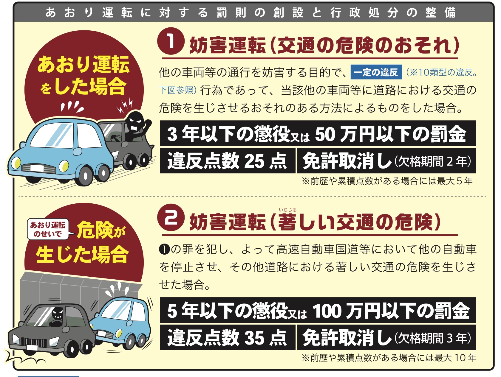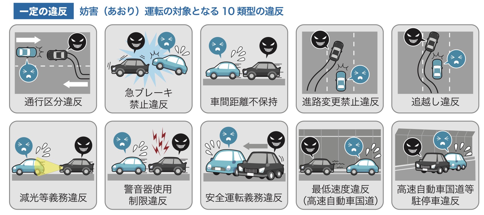 煽り運転は前方、あるいは後方、側方のクルマに対し、クラクションやパッシング、左右に揺さぶっての走行、車間距離を取らない、前で必要なく急ブレーキをかける、車両を停車させるなどの行為だ。妨害運転罪が施行されてからは、これらの行為を行なうと即座に免許取消し、内容によっては免許を取得できない欠格期間が2年以上になることもある。
