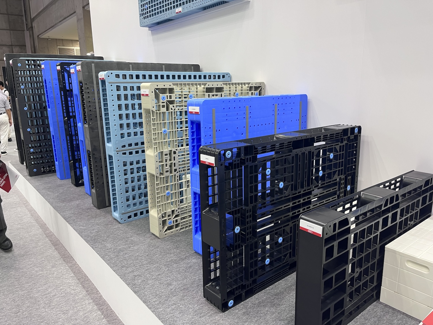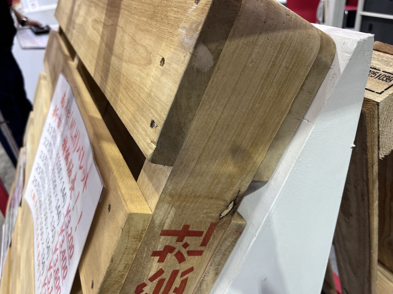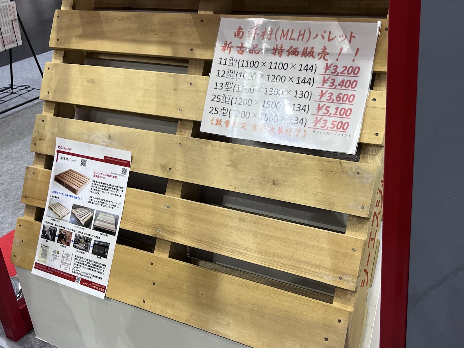 会場内を歩いていたら「新古品」という表示の木製パレットを見つけた。これはどういう意味なのかブースを展開していたパレットメーカー、シーエスジャパンの説明員に尋ねてみる。