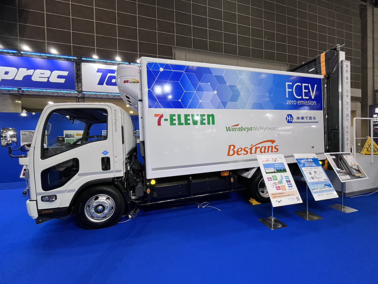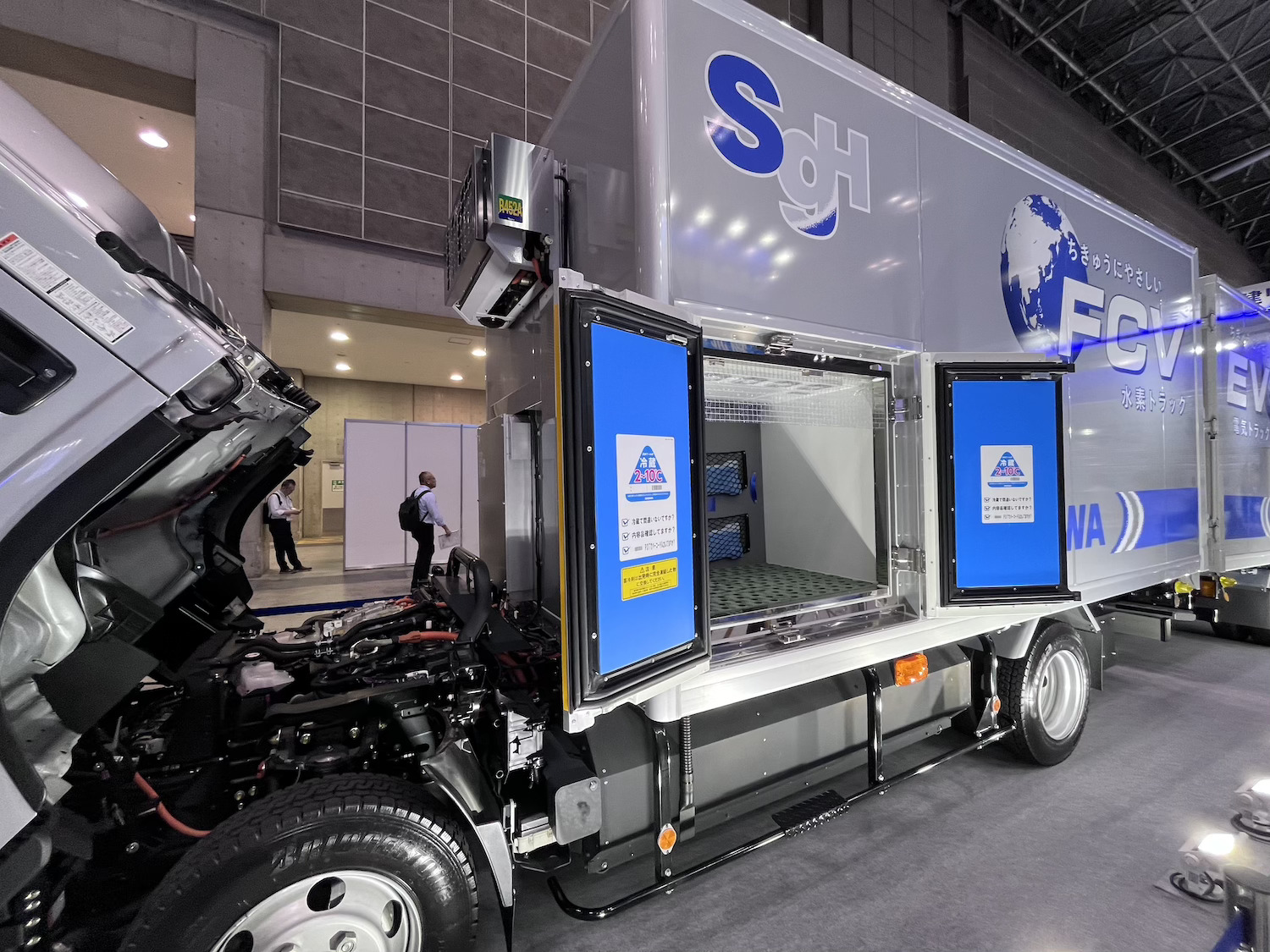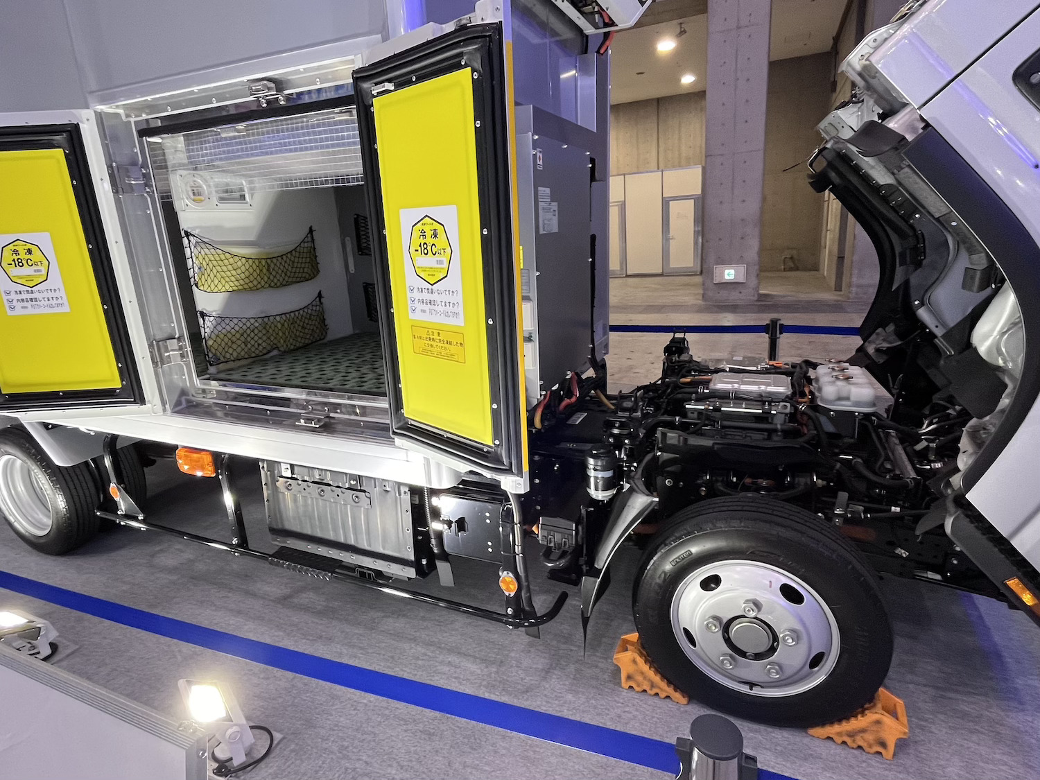 佐川急便もEVトラックとFCEVトラックの実証実験車を展示していた。こちらはボディ全体が冷凍仕様になっているわけではなく、ボディの左右に設けた小さなスペースが冷凍庫と冷蔵庫となっている。