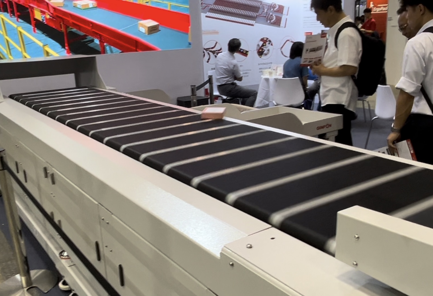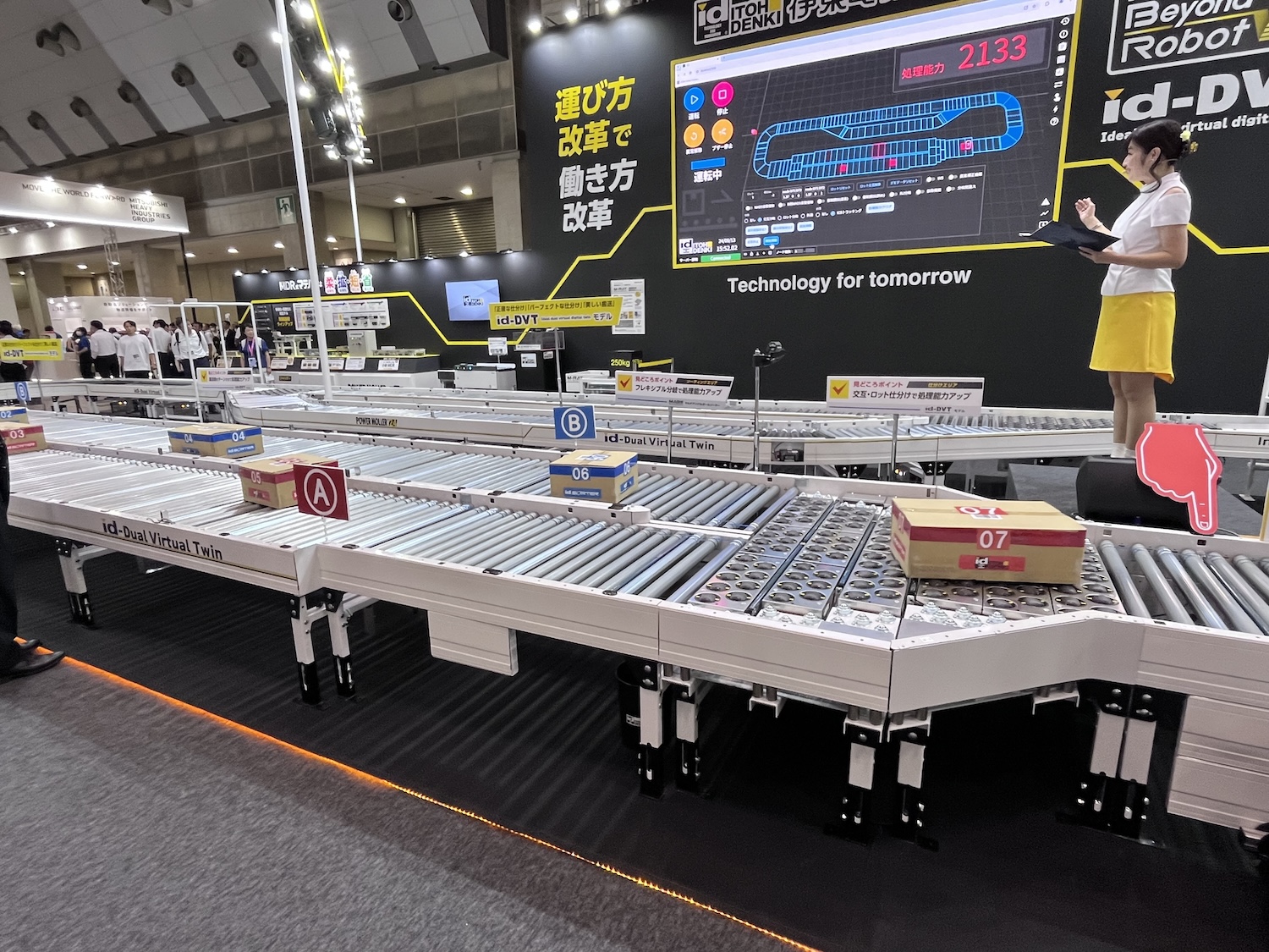 大型モニターに映し出されている映像は早送りしているのではないかと思うほど、メインのベルトコンベヤーのスピードは速く見える。しかし実際に展示されているデモ機も変わらぬスピードでベルトを走らせていた。