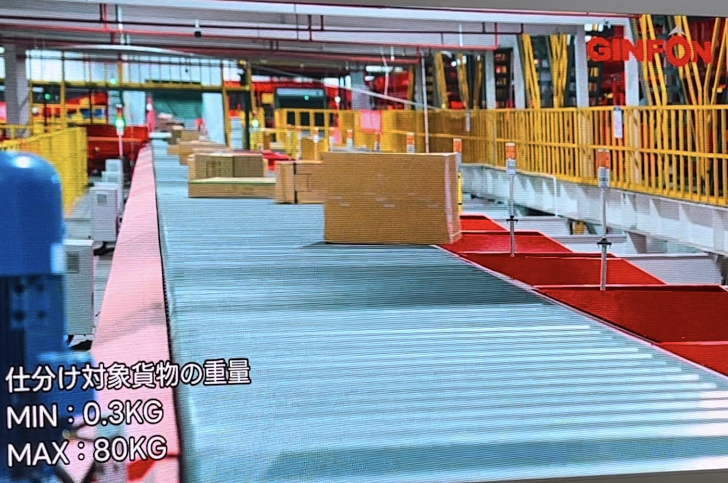 ベルトコンベヤーを使って荷物を運びながら、上部のカメラでバーコードを読み取り、行き先を認識する。そして、行き先ごとのエリアに荷物が到達するとベルトコンベアに組み込まれた横方向のベルトを動かして、目的のコンテナにシュートする。