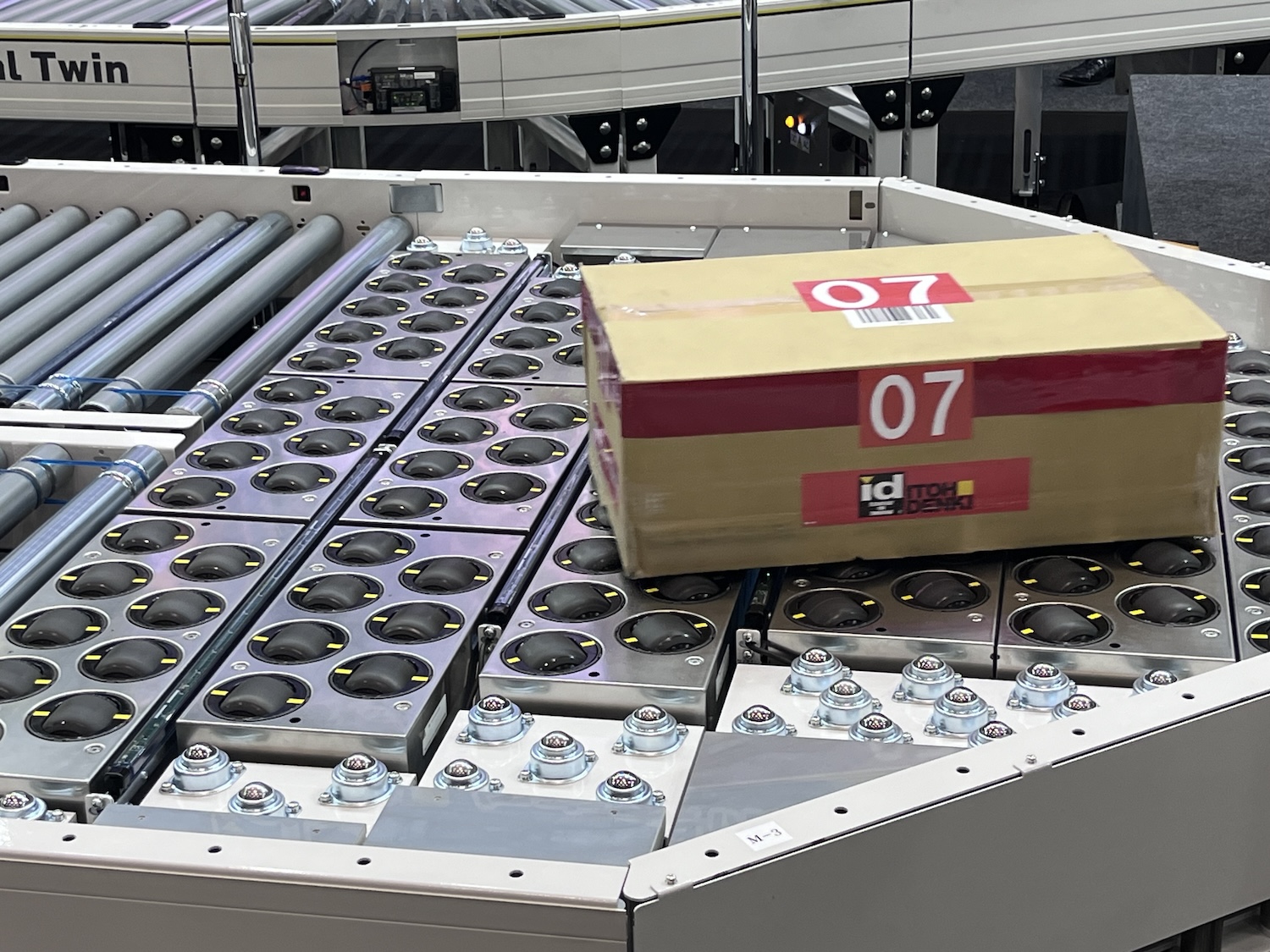 コンベヤーの進行方向を変化させることで荷物を振り分ける機構を採用しているシステムもある。これはボール状のローラーが並んでいるコンベヤーでローラーの向きを変化させることで荷物の行き先を変えるのだ。