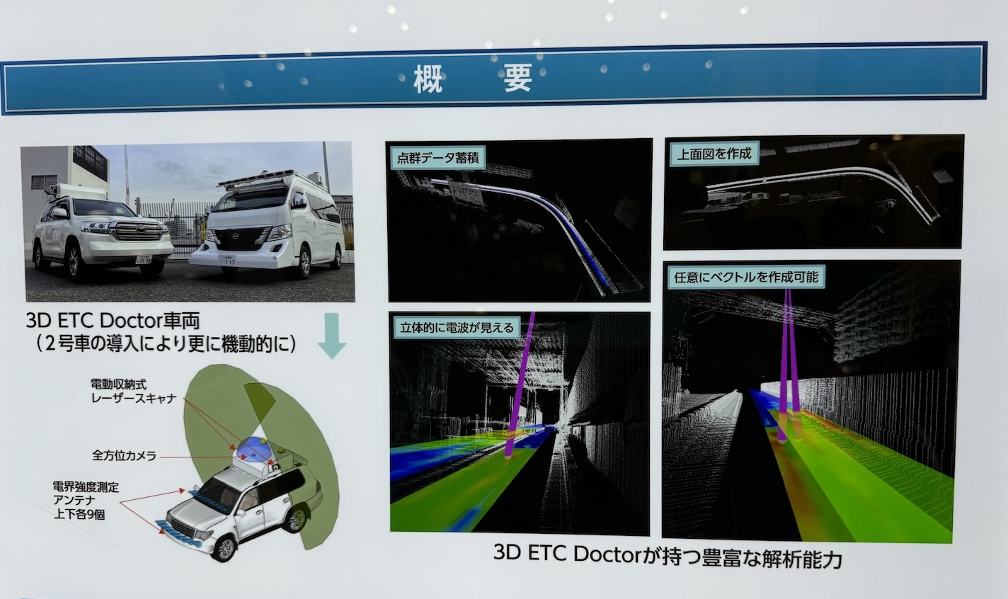 しかし3D ETC Doctorが開発されてからは、日中に一般車両と一緒に走行しながら電波強度や反射波、電波漏洩を測定し、レーザースキャナによる3D解析によって位置情報も正確になってより緻密な電波環境の分析が可能になった。今後はより安全で交通の障害にならない調査により、ETCの信頼性を維持していくことだろう。