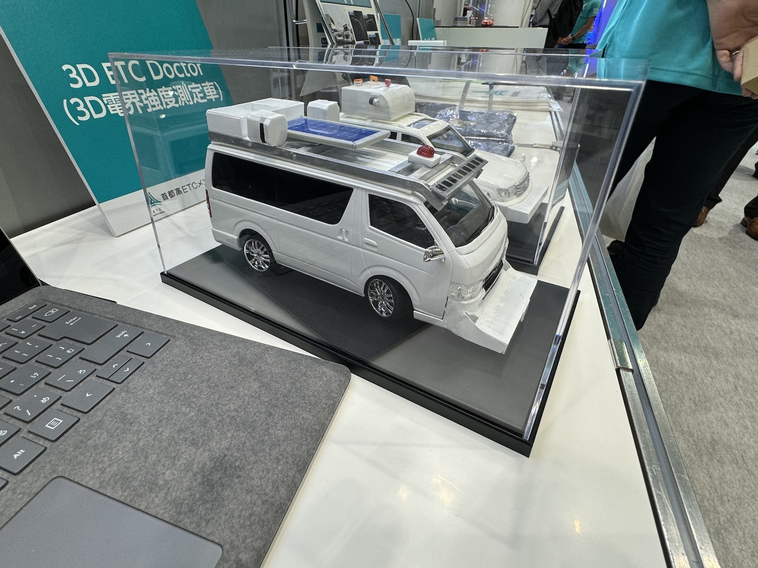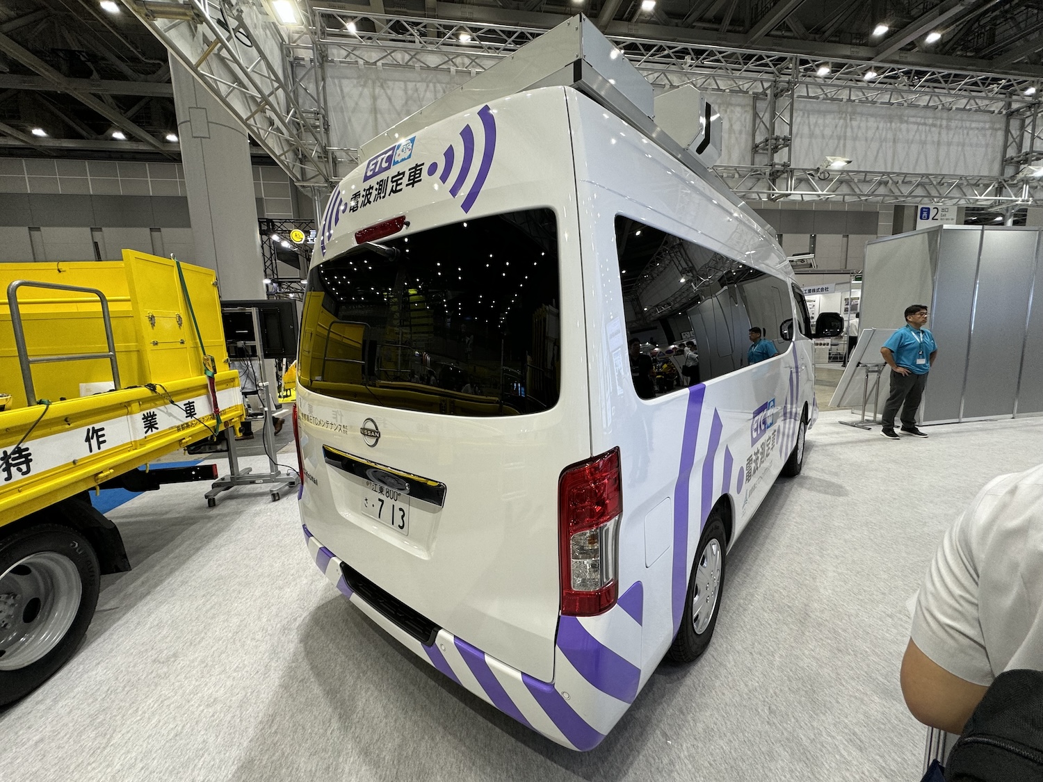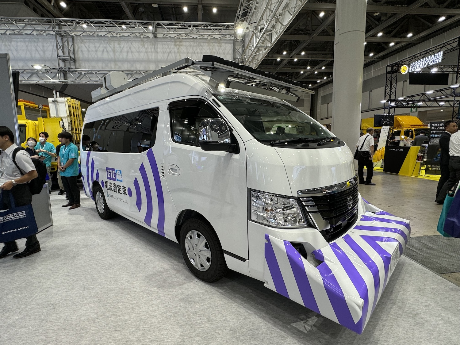 目に付いたのは日産キャラバンをベースにした3D ETC Doctor(3D電界強度測定車)だ。これはルーフに全方位カメラとレーザースキャナを備え、延長されたフロントバンパーとフロントウインドーの上部にバイザー状にそれぞれ9個ずつ電界強度を測定するアンテナが組み込まれている。
