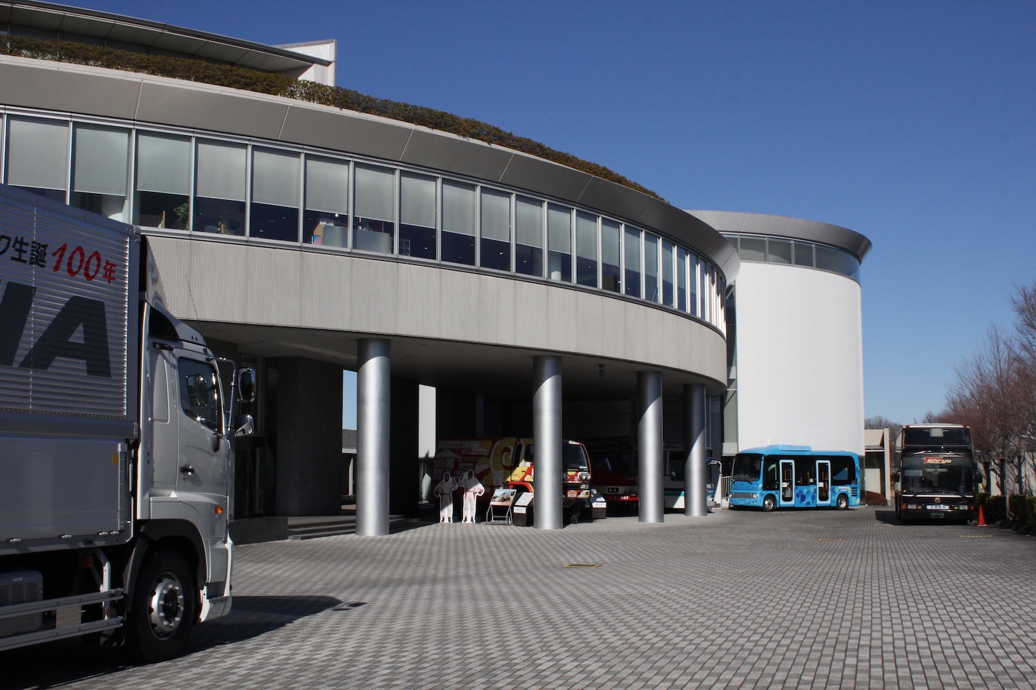 敷地内に足を踏み入れると、まずは最新のトラック、そしていにしえの名車たちが屋外展示されており、入館者を出迎えてくれる。円をモチーフに様々な部分に取り入れた建物は、なかなかユニークな造形で日野自動車の研修センターも兼ね備えており、かなり大きなものだ。