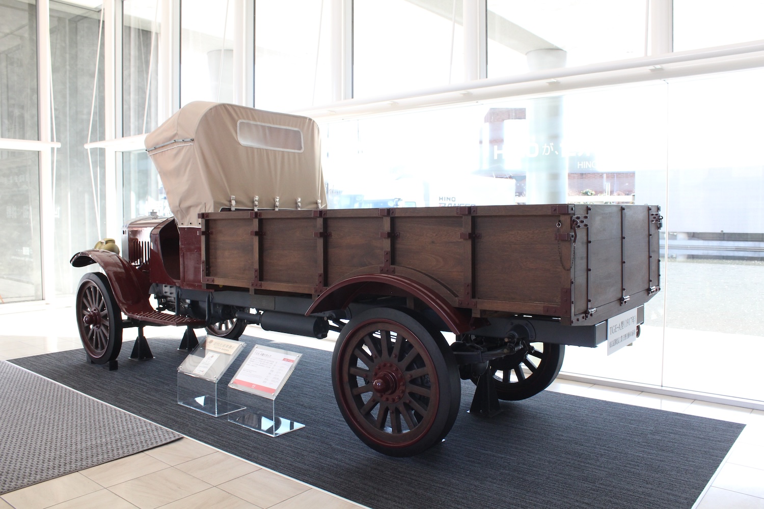 エントラントには、日野自動車のルーツとも言える東京瓦斯電気工業が作った最初のトラック、TGE-A型が展示されている。ホイールが木製で、ヘッドライトはガス灯というのは1917年ならではの仕様であり、実車は近年作成されたレプリカではあるものの、当時のまま忠実に再現されている。エンジンやラジエターなども現代のトラックとはまるで異なり、シンプルで手作り感に満ちた造りだ。