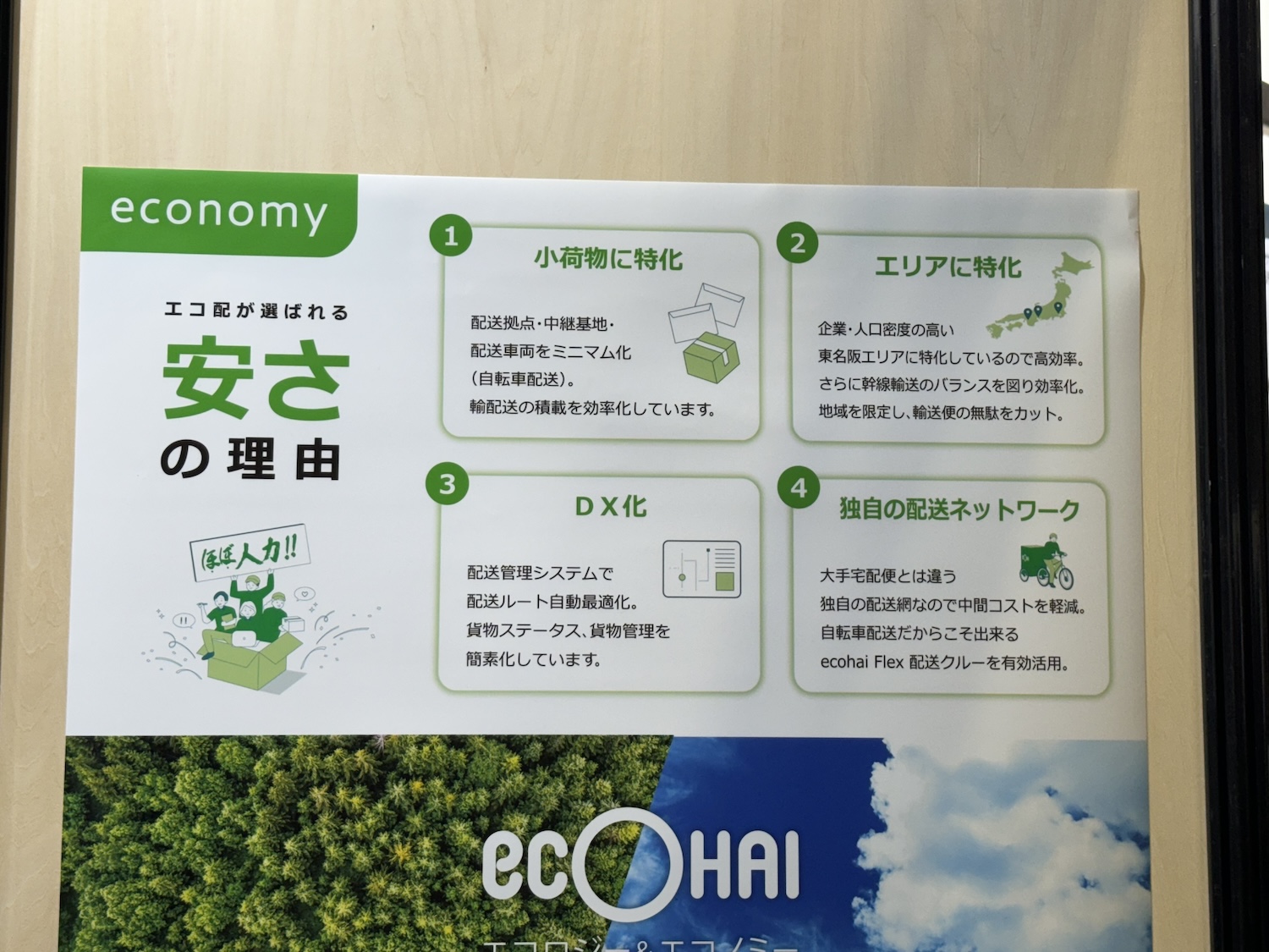 さらに人口密度の高い東名阪エリアに地域を限定している。また密集している地域では自転車でリアカーを引きながら配送することにより燃料コストを削減するだけでなくカーボンオフセットにより、トラック輸送分も相殺することでCO2の排出量を実質的にゼロにできるのだとか。