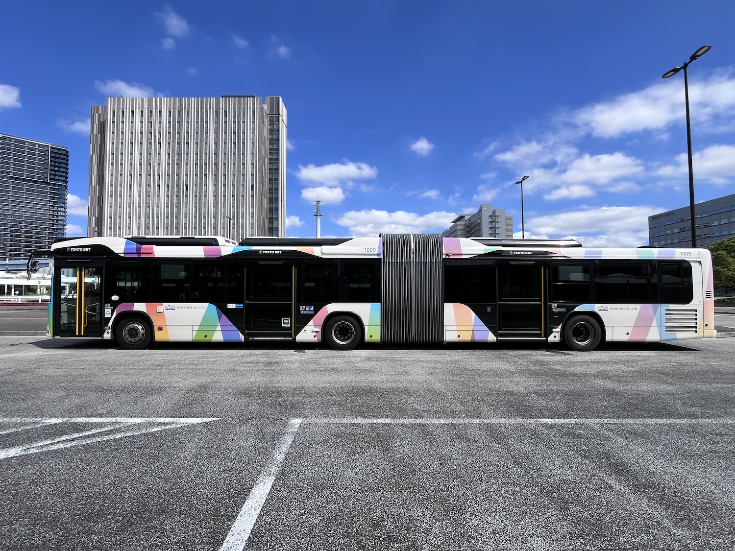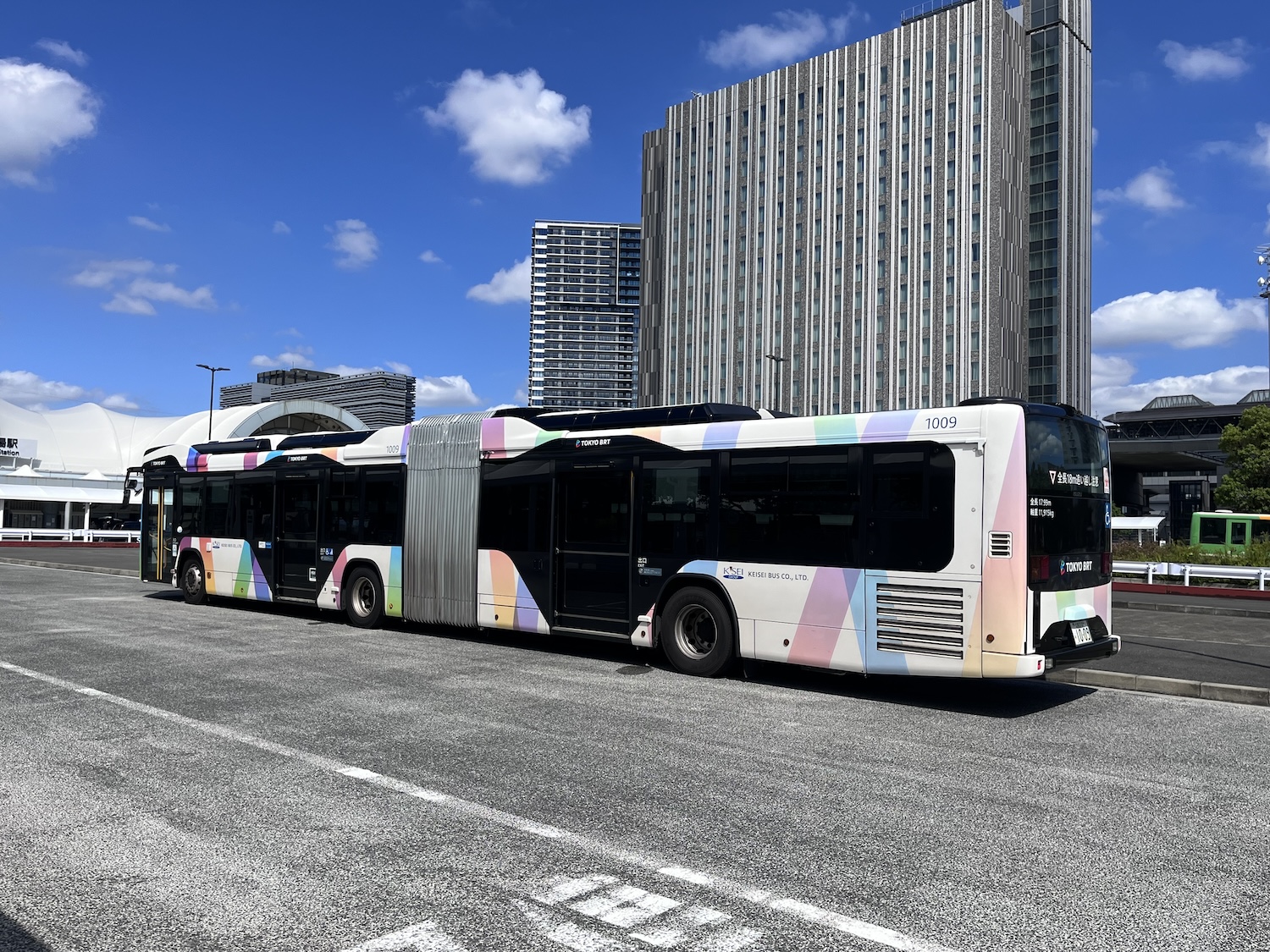 それは連節バス。文字どおり節を持った連なっているバスのことで、トレーラーとは違い車内は電車のようにつながっている長いバスだ。