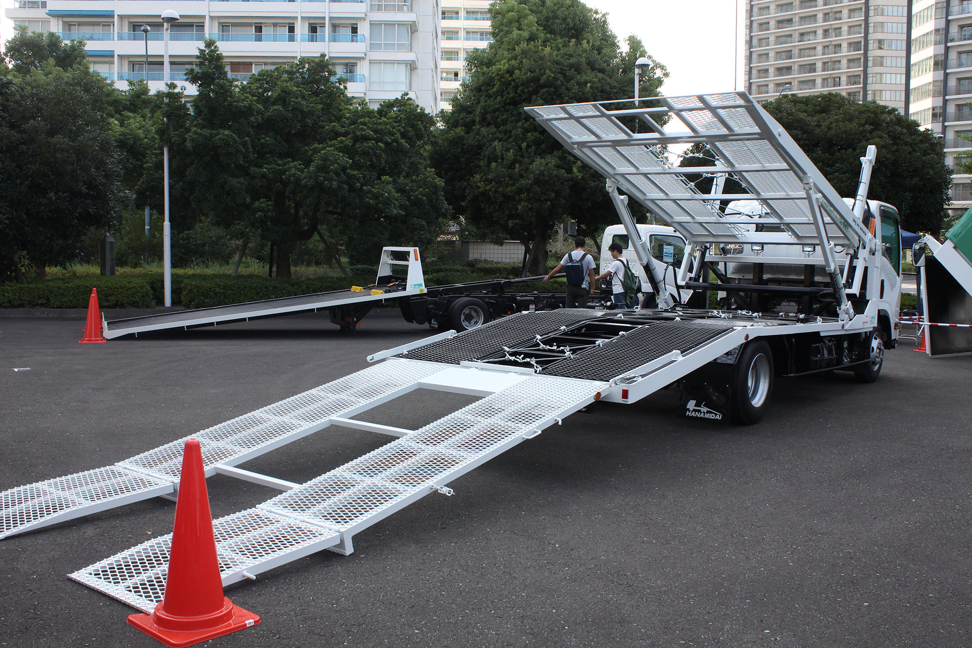たとえば、ダンプカーのように荷台を傾けて荷物を降ろす機能などは、その代表といえよう。土砂を平ボディのトラックから降ろす場合、ショベルでの手作業やショベルカーなどでかき出す必要が生じる。しかし、ダンプ機能で荷台を傾ければ、短時間で労力をかけずに荷降ろしができるわけだ。加えて、積載した土砂の重量を量る機能が付加されているタイプもある。これなら、過積載を防止すると同時に必要量だけ積み込むなどといった、効率的な運搬が可能になる。