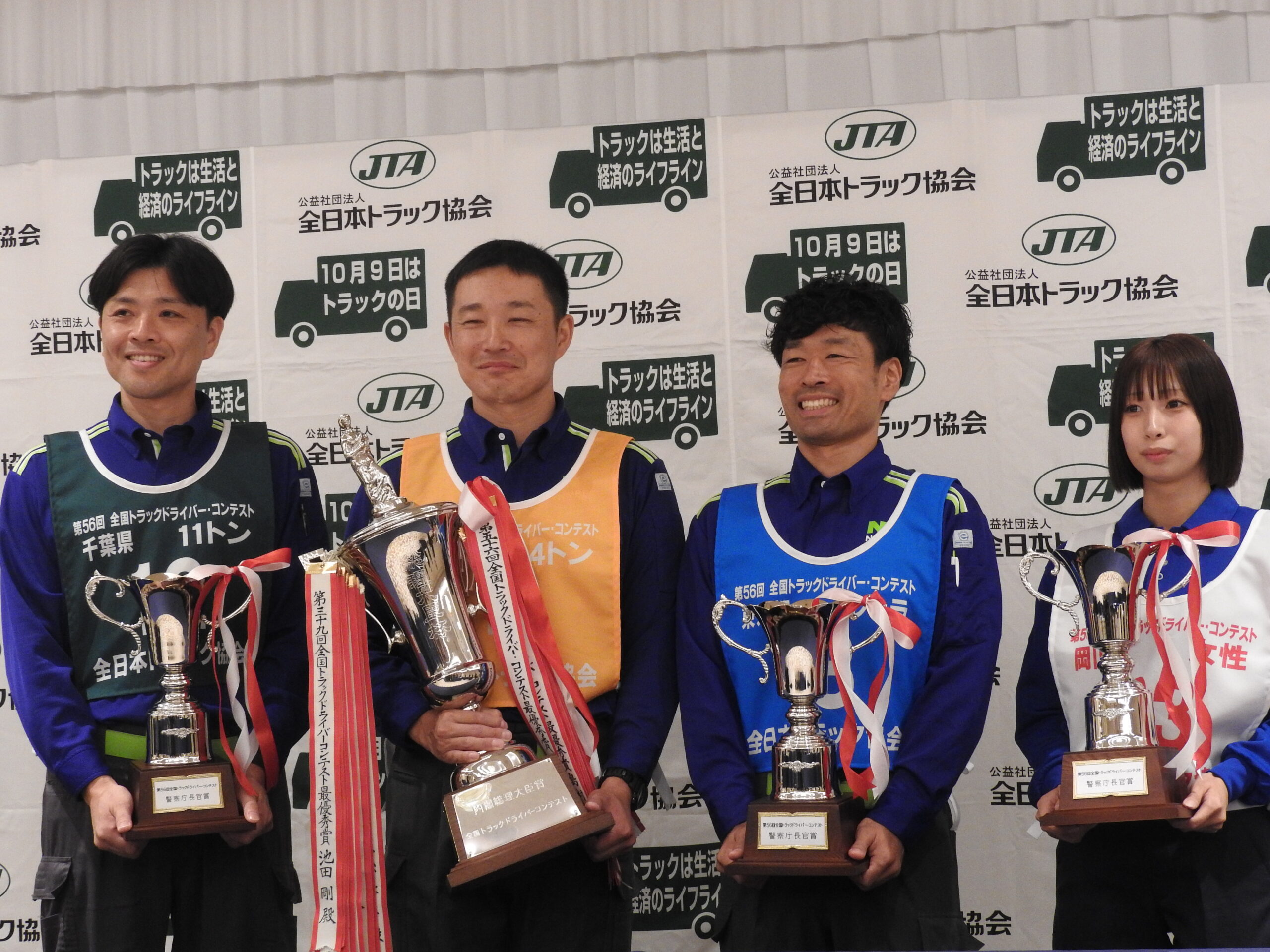 2024年10月28日に「第56回全国トラックドライバーコンテスト」(同26日・27日に開催)の表彰式が東京都港区のホテルで挙行された。4トン・11トン・トレーラー・女性の各部門からそれぞれ上位5名など、総勢20名を超えるトラックドライバーが、仲間や前日までしのぎを削り合ったライバルに迎えられて登壇した。