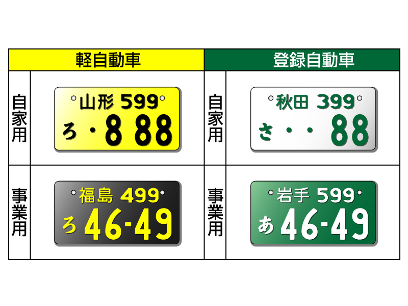 ちなみに同じ運送業で使われるナンバーには「緑色のナンバー」もありますが、これは、旅客自動車運送事業や貨物自動車運送事業を対象にしたナンバーなので、軽自動車には付けられません。(一般貨物自動車運送事業は軽自動車ではなく、トラック、バン、自動二輪を使って運搬する事業形態)