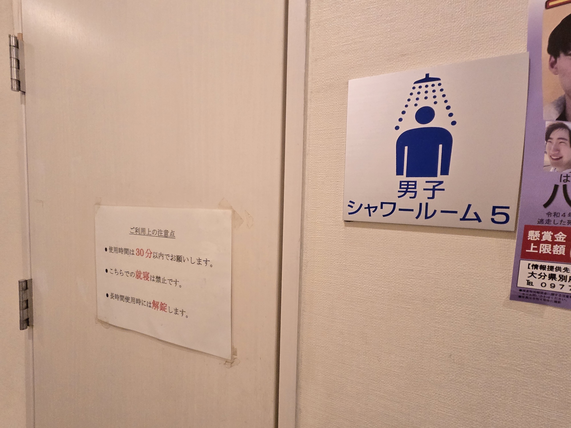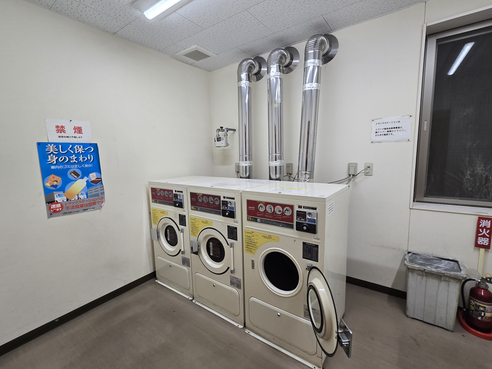 奥に進むとコインランドリーがあり、こちらももちろんトラック協会会員事業者のみ使用が可能。シャワールームも使えるのは資格者のみだが、なにが驚いたかってシャワールーム内での「就寝禁止」の張り紙。え! こんな場所で寝ちゃう人がいるの? という素朴な疑問です。