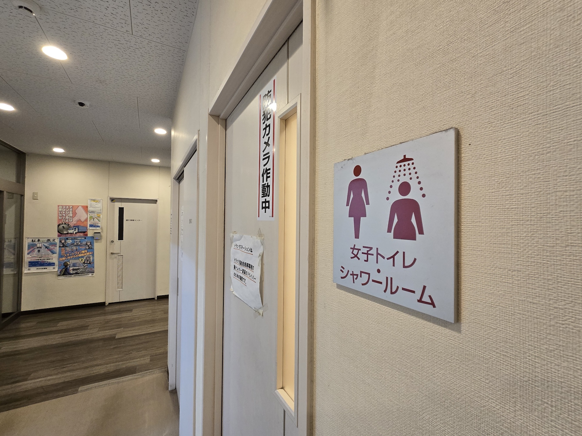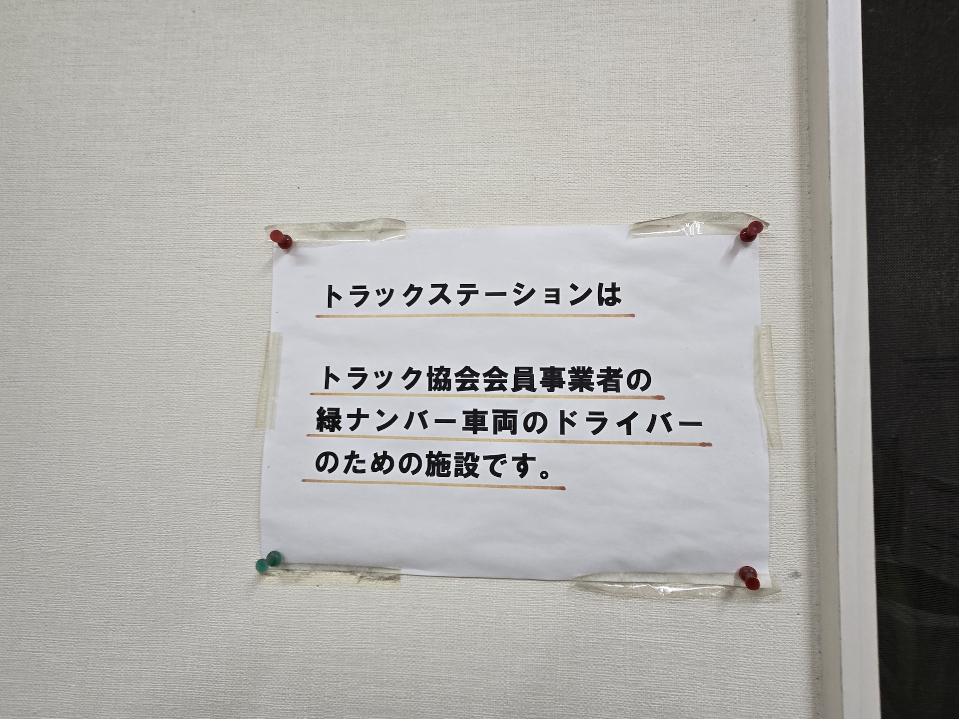 コンビニと繋がっている建物を進むとあちこちに「トラックステーションはトラック協会会員事業者の緑ナンバー車輌のドライバーのための施設です。」の注意書きが貼ってある。