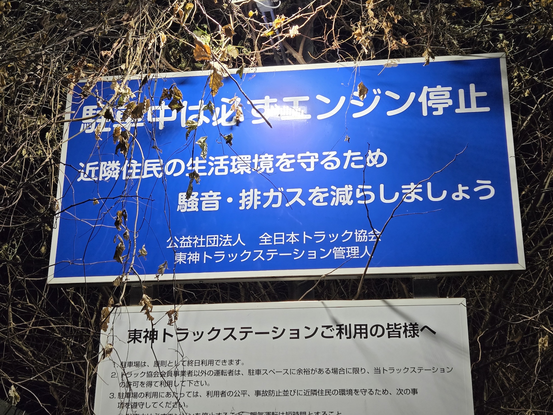 高速のパーキングエリアとはちょっと雰囲気のち違う夜のトラックステーション。昼夜問わず働くトラックドライバーの皆さんの大変さを垣間見たような気がした。