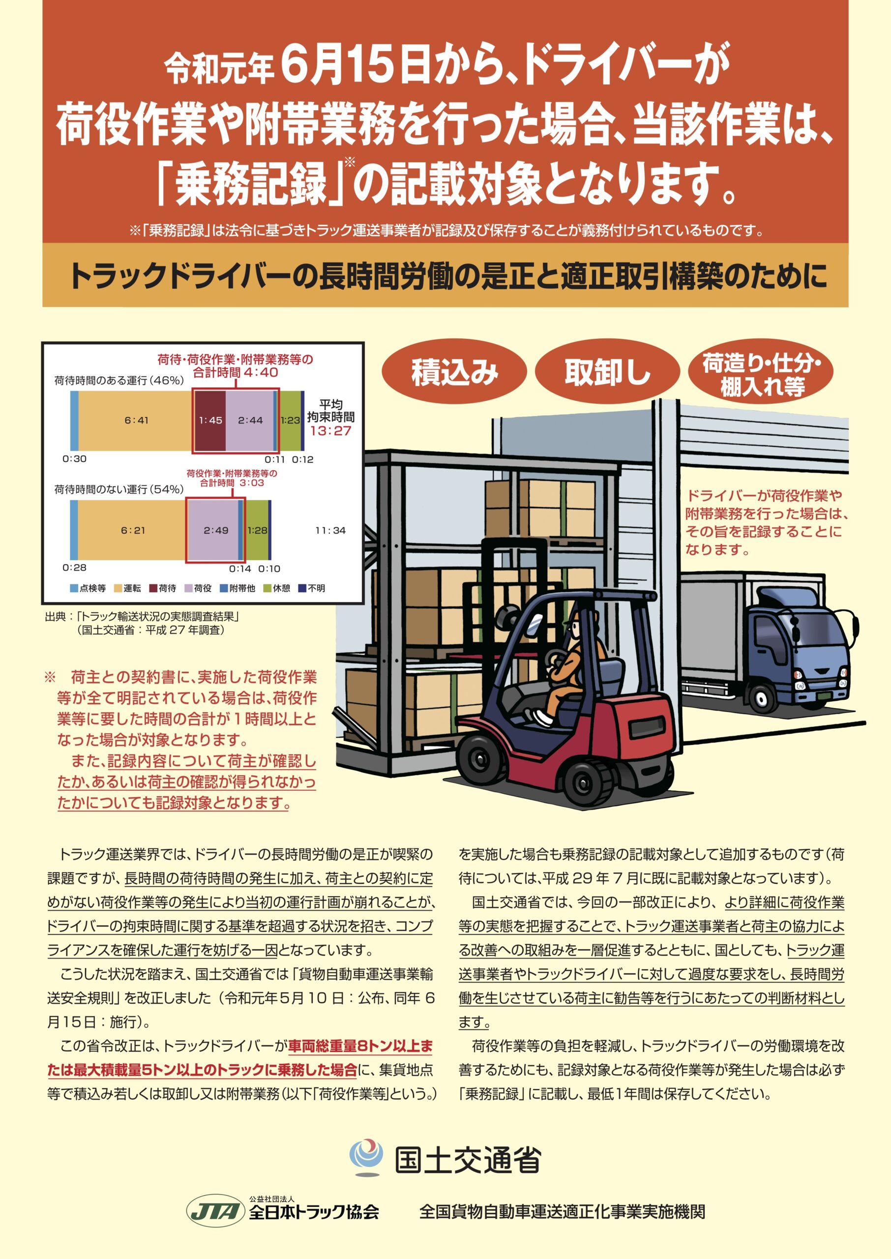 積卸し、検品、仕分け、荷造り、棚入れ、ラベル貼り、ピッキング、はい作業(袋や箱の荷を積み上げたり、荷を移動するために崩したりする作業)受注、返品、クレーム等の受付作業、廃棄物の処理などであり、これらの作業は2019年6月より「乗務記録」を記載するよう定めているため、乗務記録をつけずに付帯業務をさせることはできない。