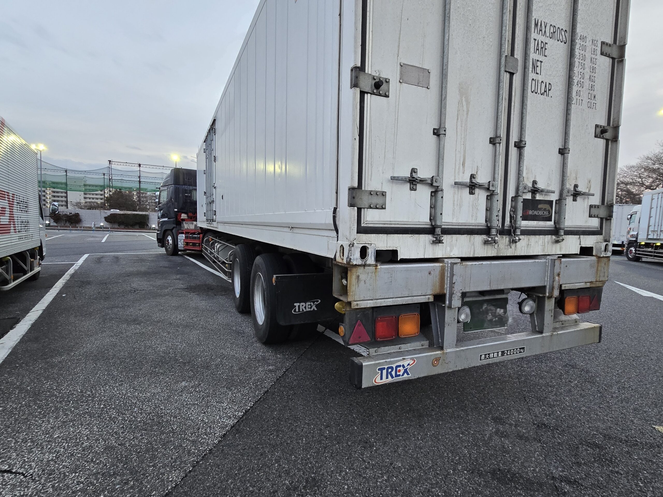 最初に説明するのは荷台の後部に装着されている三角形のリフレクターについてです。形自体はオーソドックスな三角形のリフレクター(反射板)。実はこの三角形のリフレクターは「トレーラーであることを後続車に知らせるためのもの」です。つまり、この車輌はトレーラーであり追い越しに時間がかかることなどを後続車に知らせる意味を持っています。