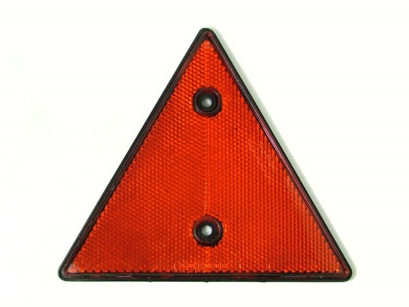 赤色で、形状は正立正三角形又は帯状部の幅が一辺 の5分の1以上の中空の正立正三角形、一辺が150mm以上200mm以下のもの。取り付け位置は反射板の上縁の高さが1.5m以下、下縁の高さが0.25m以上。夜間に前方150mの位置から走行用前照灯で照射した場合に、その反射光を確認できるもの(反射部の大きさが10㎠以上)。