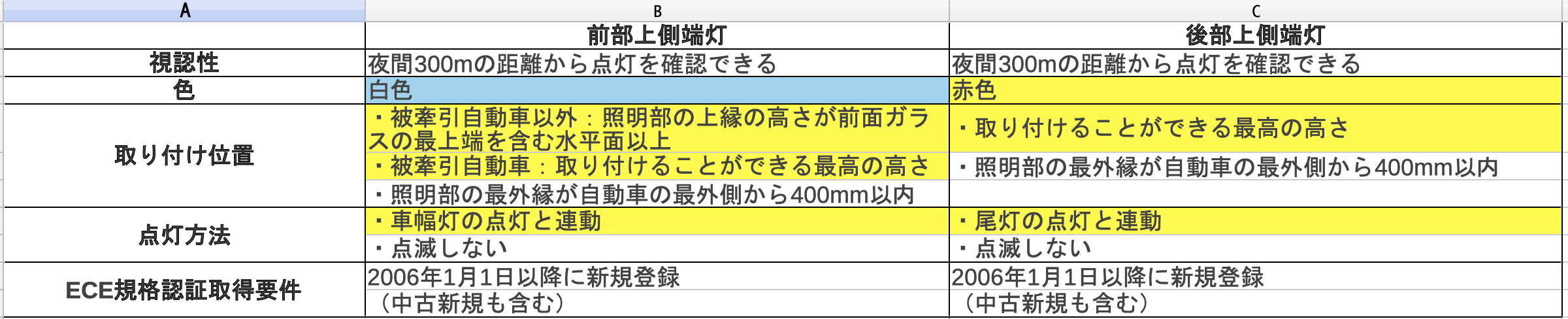 前部上側端灯の場合、夜間にその前方300mの距離から点灯を確認できるものであり、他の交通を妨げないものであること。色は白色で前部上側端灯の照明部の最外縁は、自動車の最外側から400mm以内だ。また車幅灯が点灯しているときに、消灯できない構造でなければならない。