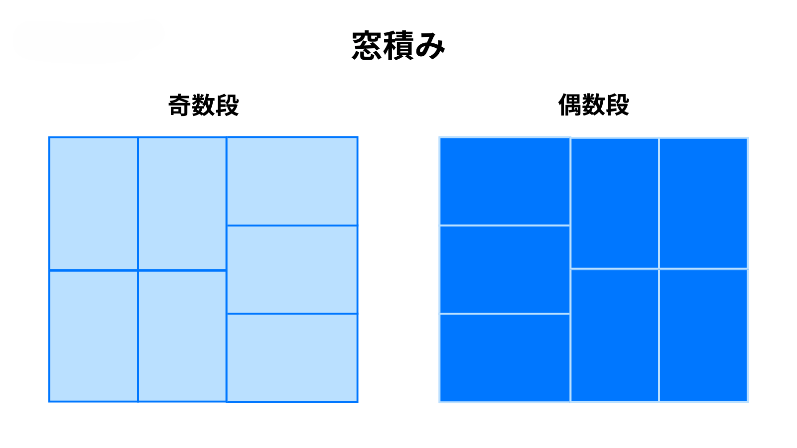 ブロック積みを一段ずつ90度向きを変えて積む方法です。横向きの力に比較的強く、荷崩れしにくいのがメリットですが、互い違いにしたときに荷物の大きさによって縦、横の長さが合わないと使えないため、1段に並べたときの全体の形が正方形になるような限られた荷物でしか使えないというデメリットがあります。