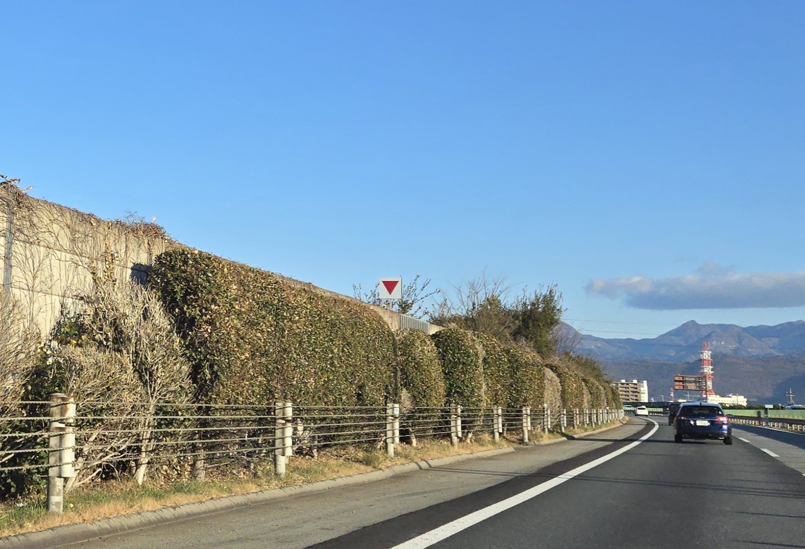 よく見ると、この逆三角マークが設置されている場所は防音壁があり、そこには扉が必ずあるので、その意味を想像しやすいかもしれませんね。こちらは降雪とは関係ないので、高速道路のあちこちで見ることができます。