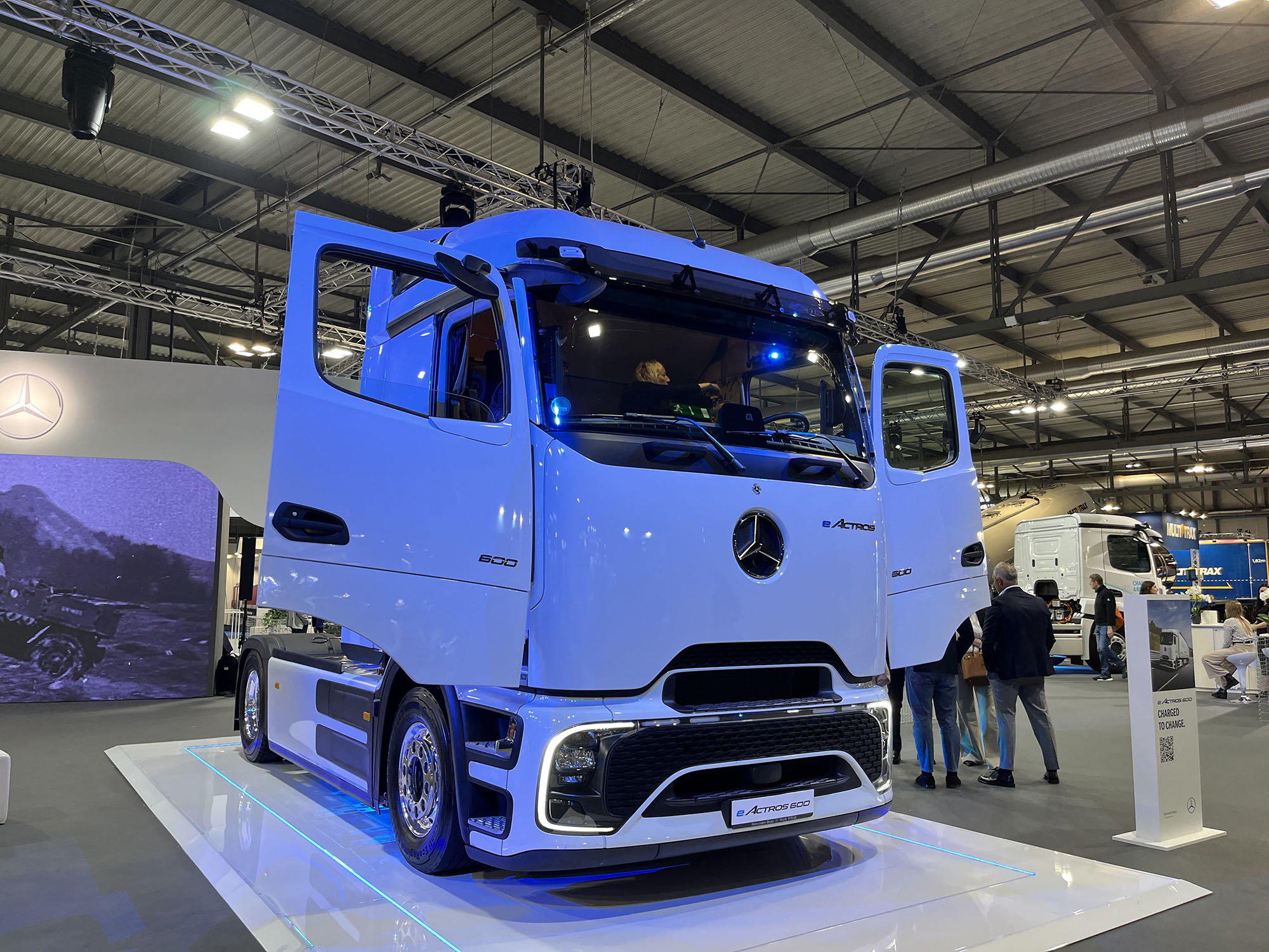 出展しているメーカーのなかで、日本でも馴染み深い会社と言えばメルセデスベンツだろう。トラックを製造・販売しているのは、ダイムラー・トラックだ。トラックの高級車「アクトロス」や多目的トラック「ウニモグ」は有名だが、消防車・ゴミ収集車・スワップボディ車などにも使用される、特装車用低床トラック「エコニック」も欧州では人気の車種。同社はメルセデスベンツグループの100%子会社であったが、現在はフランクフルト証券取引所に上場しており、持ち株比率は35%程度に下がっているという。