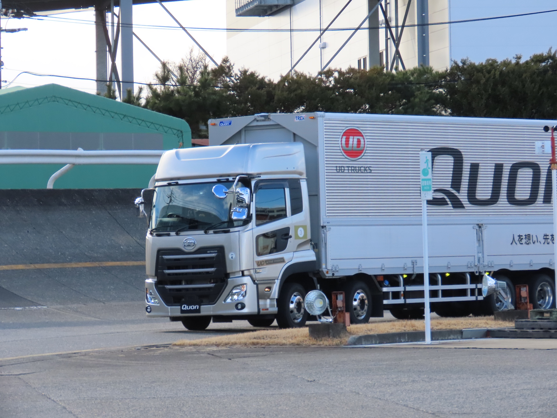 この催しはすでに九州などでも実績があり、その評判は上々であったという。今回は任期制自衛官の参加はなかったものの、定年退職予定などの自衛官が18名参加した。最初に行政や物流業界の取り組みの説明を受けた後、参加者はグループに分かれてUDトラックスの大型トラック「クオン」に乗車。定められたコースで実際にハンドルを握り、体験走行を行なった。