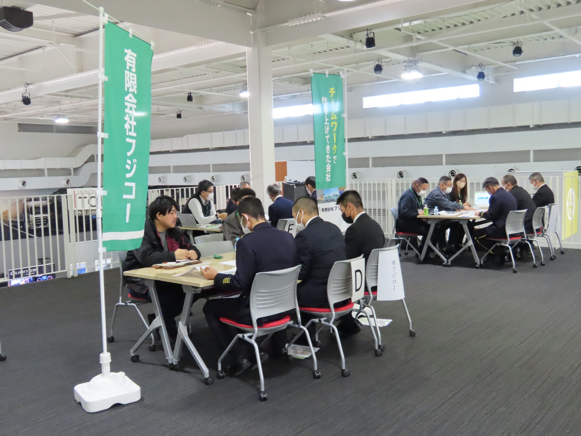 走行後に参加者は、埼玉県トラック協会に属する運輸事業者6社がそれぞれ設けたブースを回り、各事業者から事業内容・待遇などの説明を受けた。また、自衛官は運輸業界の実状やそれぞれの事業者の特徴などについて、積極的に質問を行なっていた。印象的なのは、自衛官が各ブースを訪れたときに、直立不動で礼をしてから席についていたことだ。こういったまじめさを、事業者は魅力に感じているのだろう。