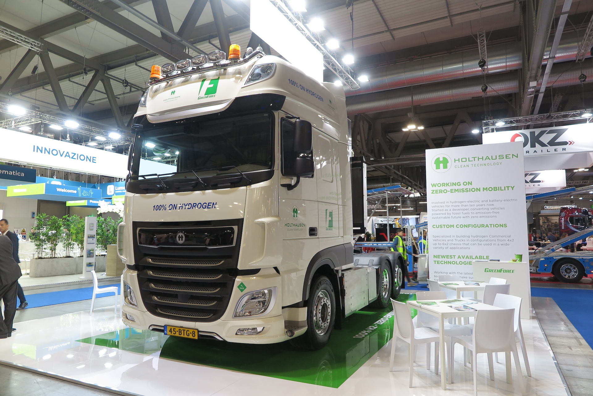 ホルトハウゼン社からはCNGとバイオメタノールが使用可能な、マルチフューエルトラックが出展されている。同社は、米ヘヴィメタバンド「メタリカ」のワールドツアーで、欧州内の移動にLNG(液化天然ガス)・バイオディーゼル・バッテリーEVのトラックを用い、輸送サポートにあたっていた縁から、展示車輌にそのイメージカラーリングを施している。