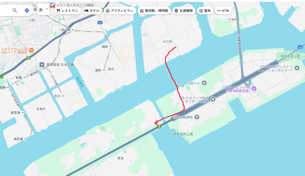唯一、一般人が扇島に入れる場所があるとすれば、それは首都高湾岸線を車で走っているときだろう。地図を見るとわかるのだが首都高速湾岸線が島内を通っている場所がある。とはいえ、そこに出入口はなく通過するだけだ。また国道357号が近くまで伸びているが、扇島手前で折り返している。