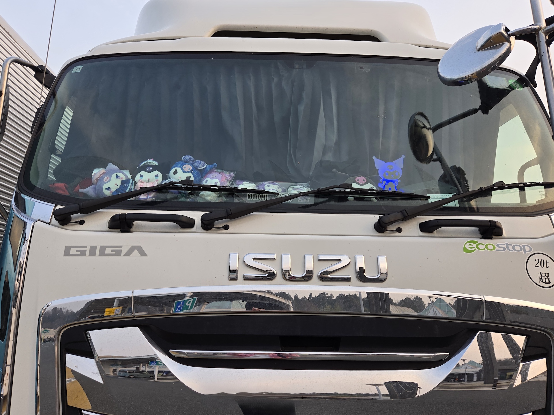まずご紹介するのはホワイトのいすゞファイブスターギガ。フロントウインドーに鎮座しているのはサンリオのキャラクター「クロミちゃん」。サンリオ公式サイトによると「自称マイメロディのライバル。乱暴者に見えるけれど、実はとっても乙女チック!?」なんだそうだ。外から確認できたクロミちゃんは9人。このトラックのドライバーは女性なのか? それとも……。