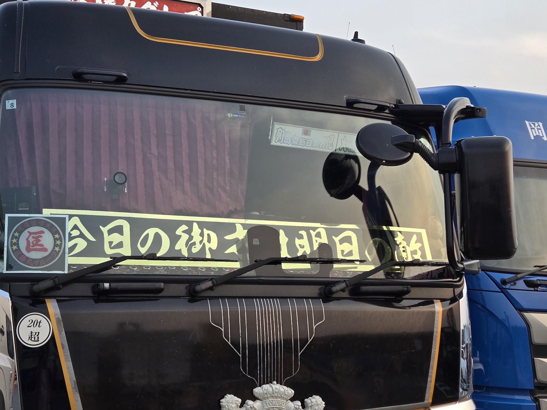 黒字に金文字という、なんとも存在感のあるスクリーンプレート。長距離トラックでは定番のビジュアル。残念ながらフロントに設置してあるカメラで中央の文字が識別できなかったが「今日の卸●●は明日の敵」●の部分が気になります。画像ではわかりにくいが、プレートの下にズラっと並んだ芳香剤の瓶がベテランのオーラを放っています。