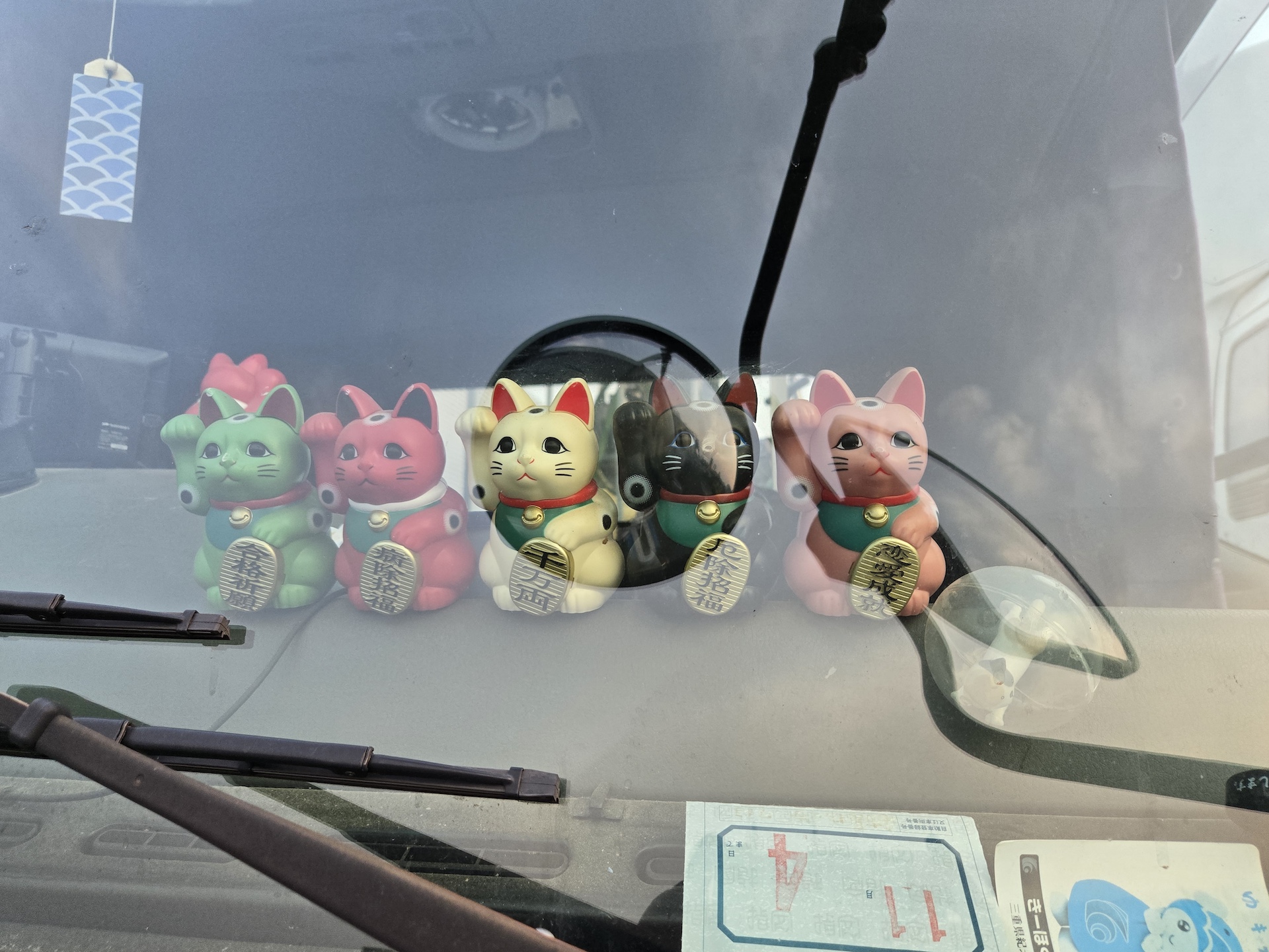 カラフルな招き猫。前向きに5匹と後向きに一匹の合計6匹。前を向く招き猫の持つ小判にはそれぞれ違う合格、厄除け、恋愛などの文字。これって一匹ずつ増やしていったのでしょうか? 安全祈願がないのは気になりますが、いずれにせよ招き猫愛を感じます。