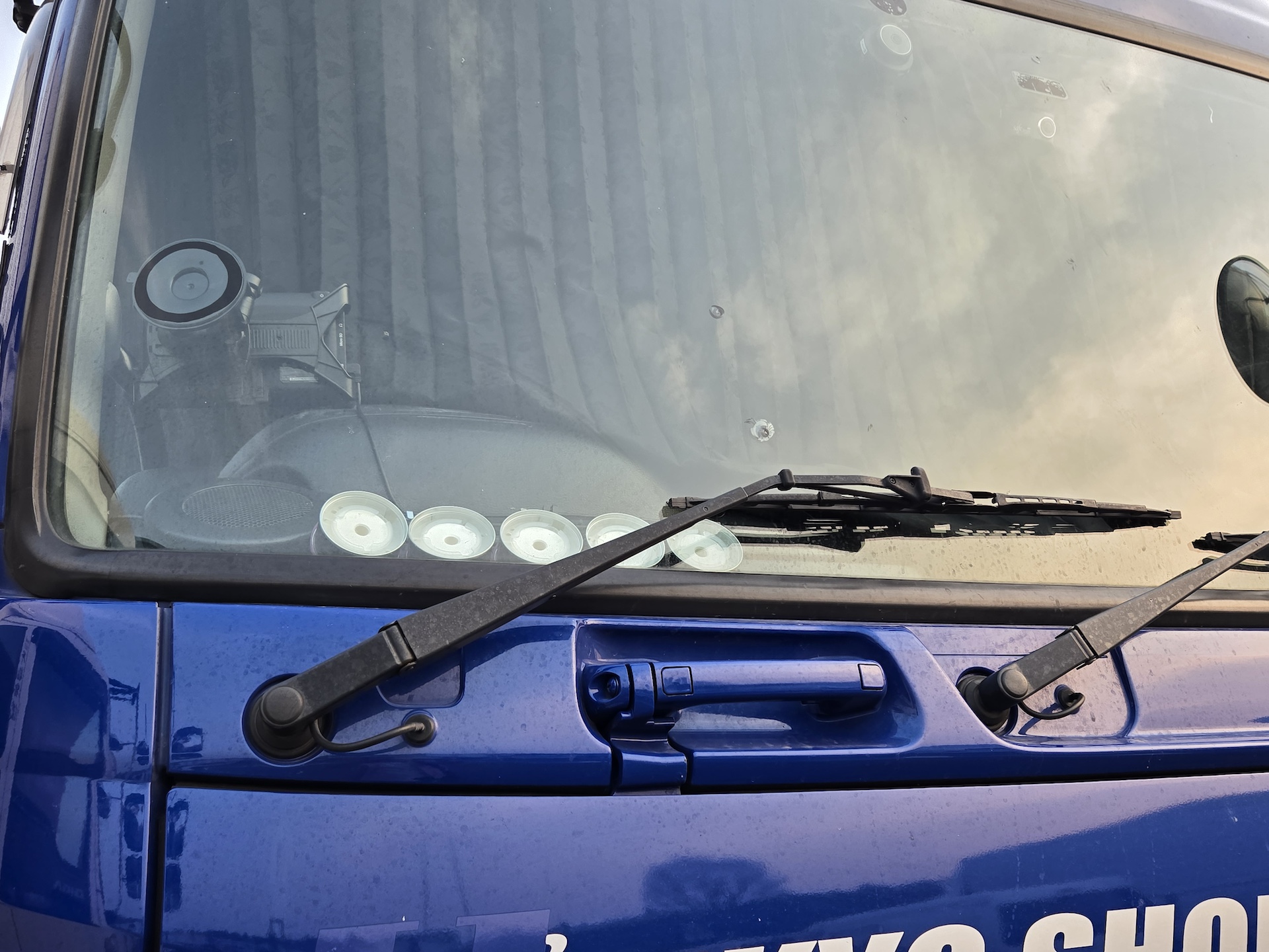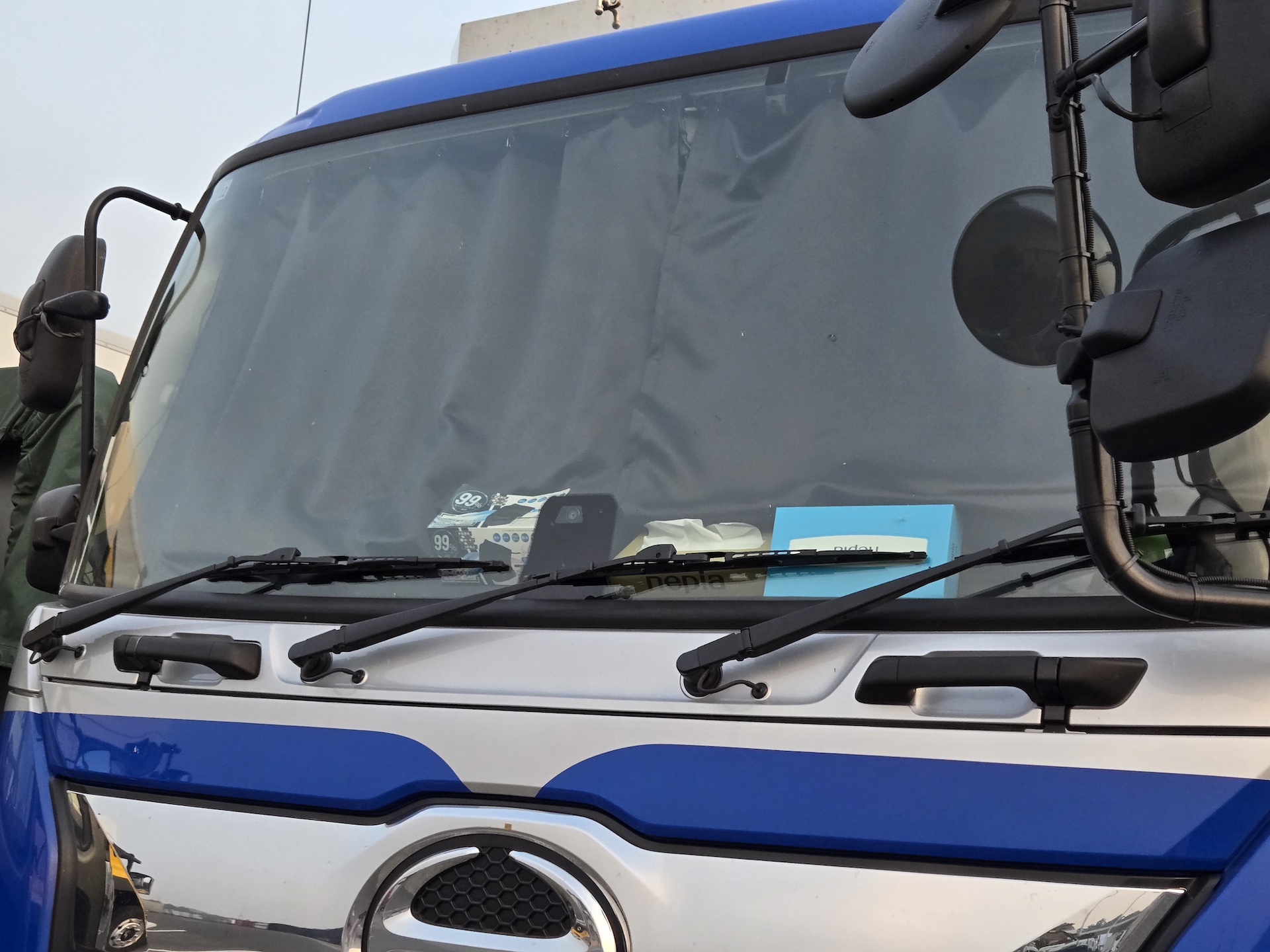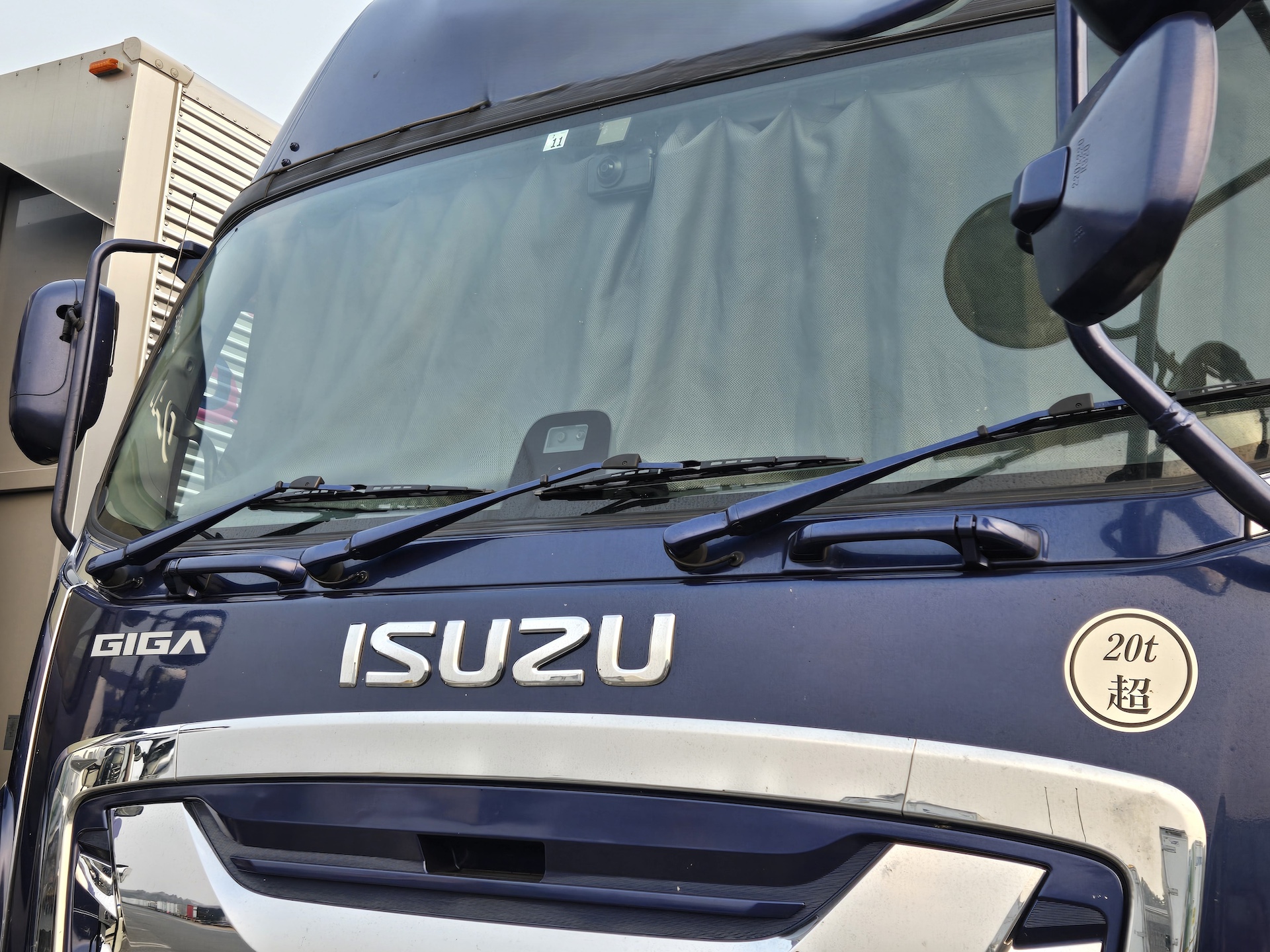 もう、何もない。潔いくらい何もない! あるのはカーテンとドライブレコーダーのみ。会社の規則でフロントウインドーには何も置くなというルールがあるのでしょうか? 当日も多くのトラックを見て回りましたが、一切何も置いていないトラックの割合は全体の20%ほどだったと思います。シンプルイズベスト!