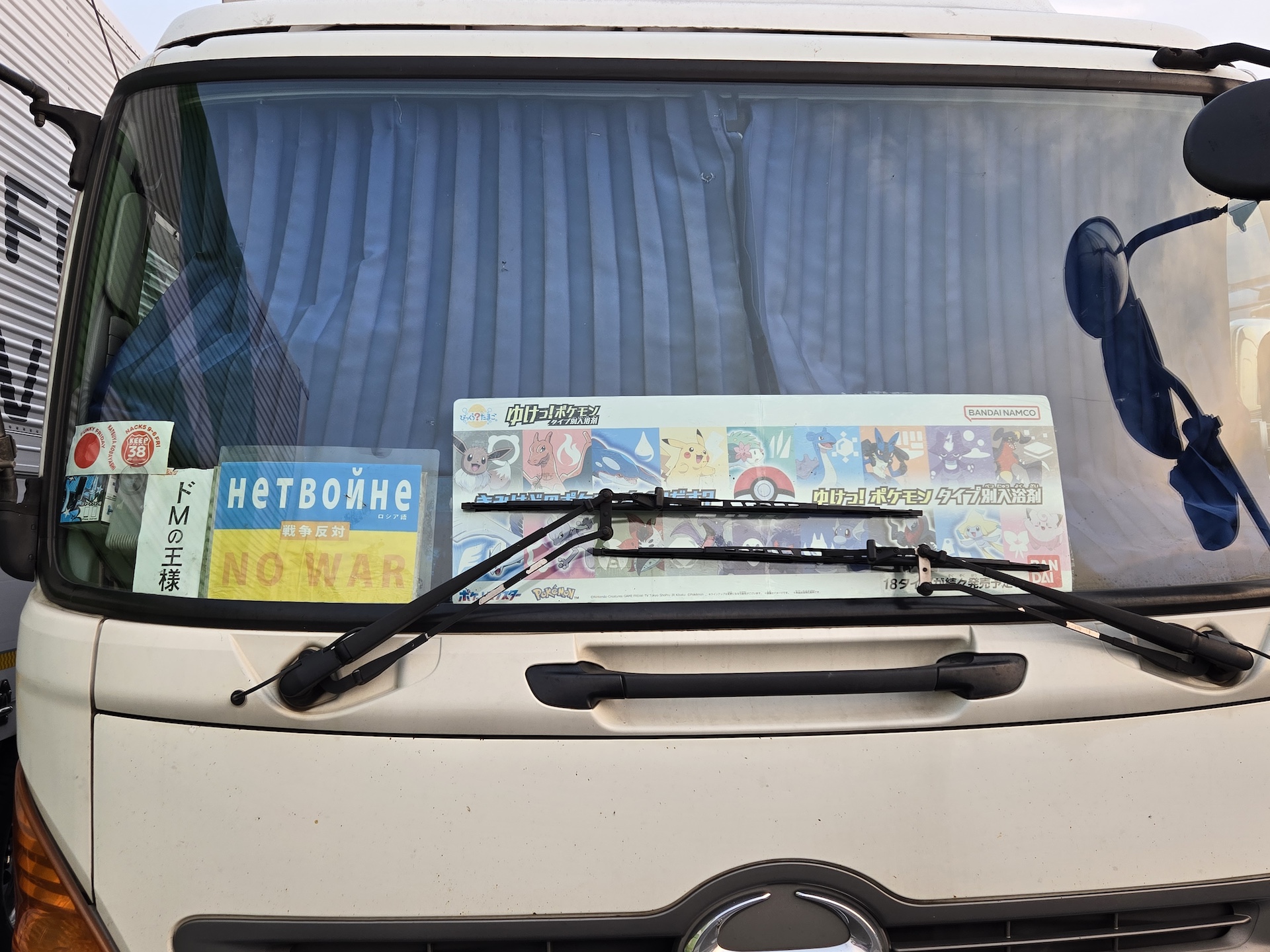 ポケモンと「戦争反対」の文字が入ったウクライナ国旗、そして「ドMの王様」の組み合わせが謎の一台。最初はドライバーにポケモン好きのお子さんがいるのかな? と思いきや、横を見て不思議な気持ちになりました。さらに一番左のステッカーはラジオDJの第一人者である小林克也の名前とNack5。懐かしくて不思議で独特の路線を進む1台でした。ドライバーさんに会いたかった。