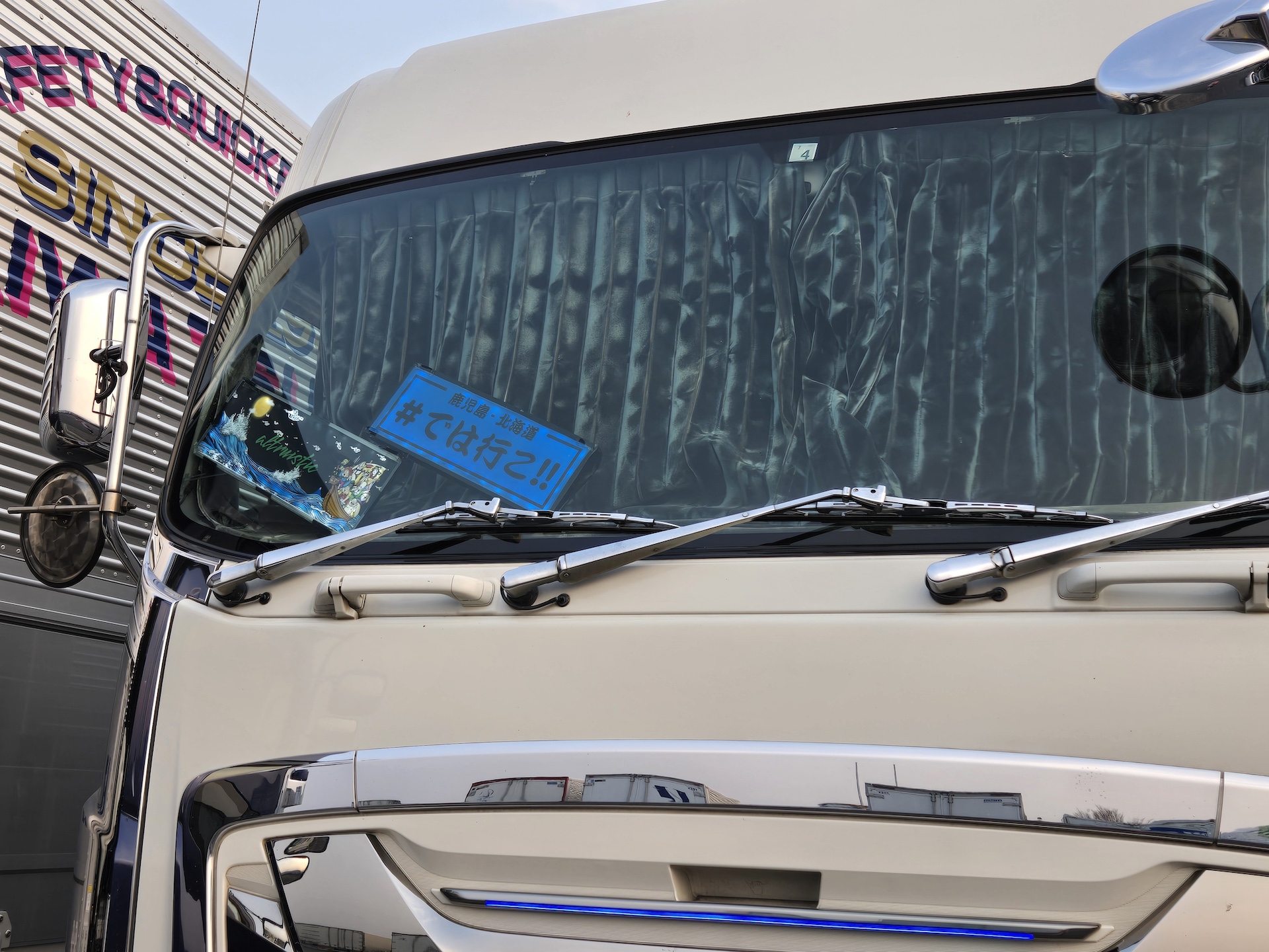 ハッシュタグが気になった一台。こちらもリサーチしてみたら全国のトラックドライバーさんたちの間では有名ななんですね。「#では行こ!!」と「#さあ帰ろ!!」があるようです。