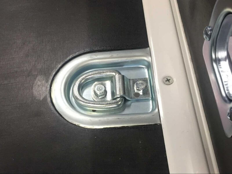 また床フックにラッシングを取る付ける方法もあります。床フックはトラックの荷室の床面に取り付けられています。床フックを使った場合、荷物を車両の下方向に押さえることができます。高さがない貨物を固定する場合や、形状が複雑でラッシングレールでは固定しづらい貨物を積載するときに有効です。