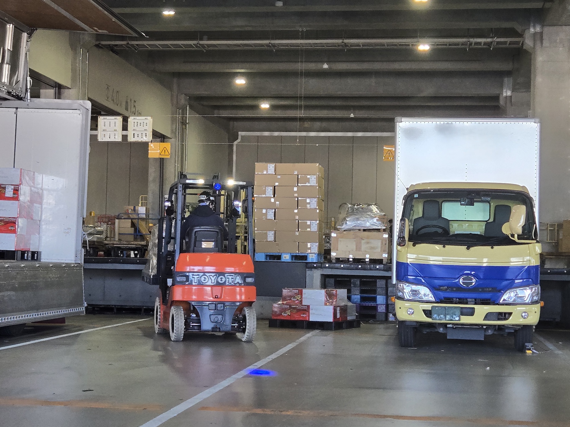 パレット積みは、パレットを使って、荷物を何箱かまとめて積み込むことです。パレット積みは、フォークリフトを使って行われます。