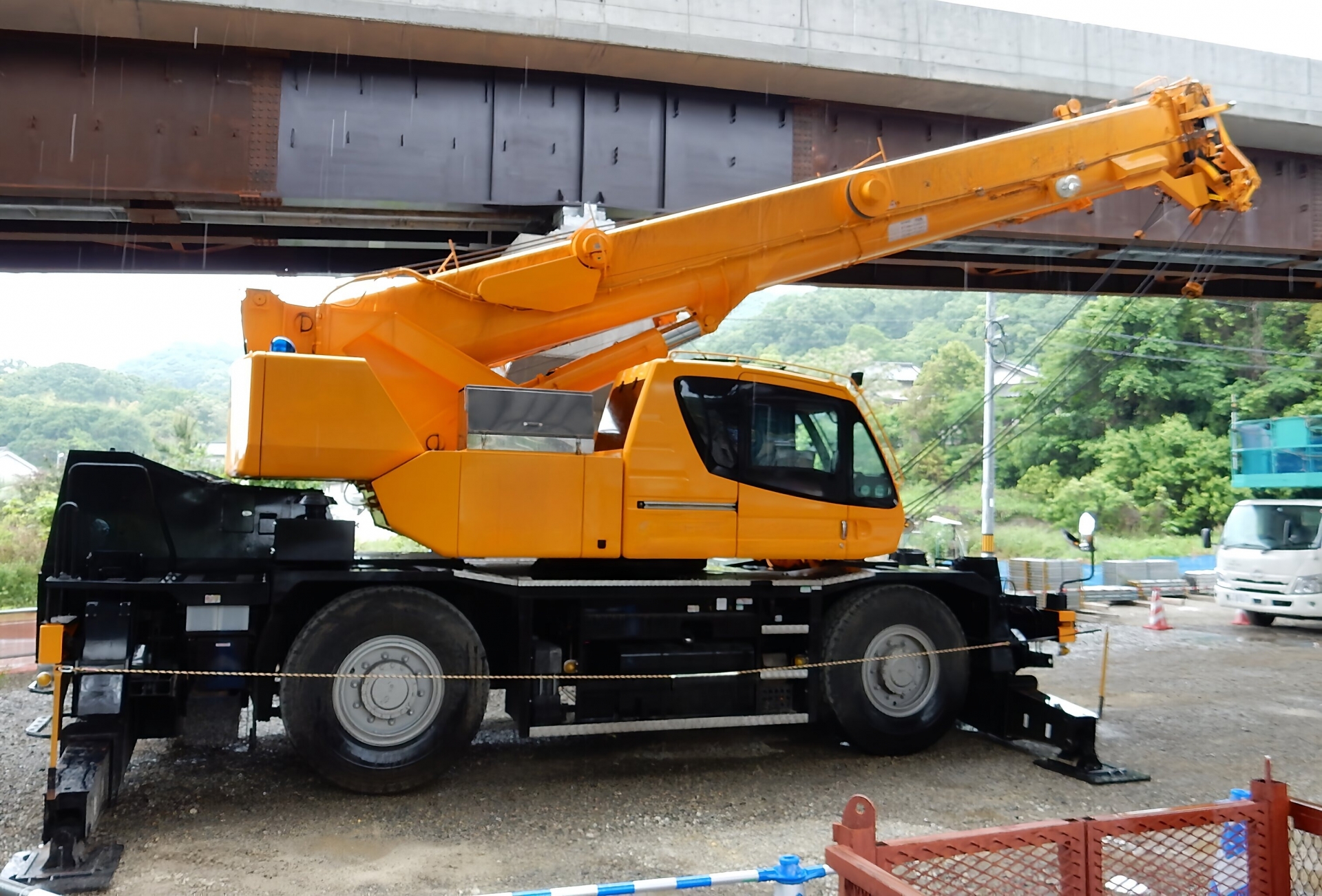 国産重機はもちろんのこと、海外製のものでも日本で使用されている車輌は性能が高く、海外でも引っ張りだこであるという。そのため、盗難が後を絶たないのだそうだ。小型のクレーン搭載トラックでも、駐車するときにはアウトリガー(車体横に張り出す転覆防止装置)を展開したり、ダンプカーでは荷台を起こしたりして、すぐには走行できないようにしている事業者も少なくない。大型クレーン車がアームを伸ばして駐車しているのには、そんな切実な理由が存在したのである。