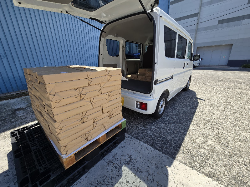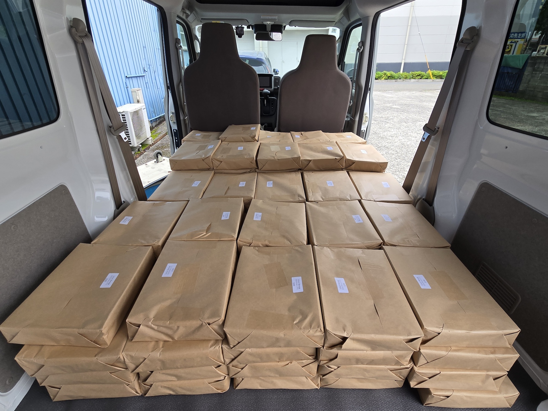 意外とスカスカ。しかしこれでも軽バンには132包みが積まれている。余った空間にぎっちりと詰め込めば、この2倍、いや3倍は載せられそうだ。