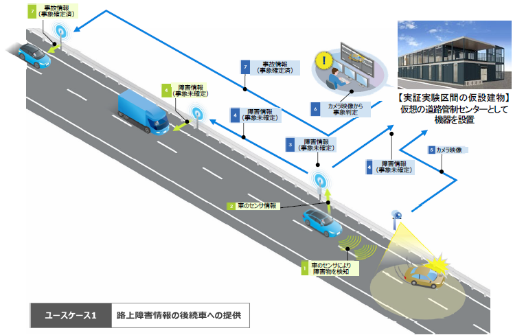 ①車両のセンサーにより、検知した前方の障害情報を後続車に通知する。