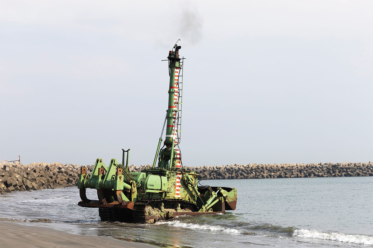 現行機であるD155W-1は水深7mまで作業が可能で、操縦は陸上にいる熟練のオペレーターがラジコンで行なうのですが、水中に入ると本体が見えなくなるため水上に出ている吸排気ダクトの傾きや、負荷音、挙動で土砂を掘削しているかを判断するというから、その操作には熟練の技が必要なことが想像できます。