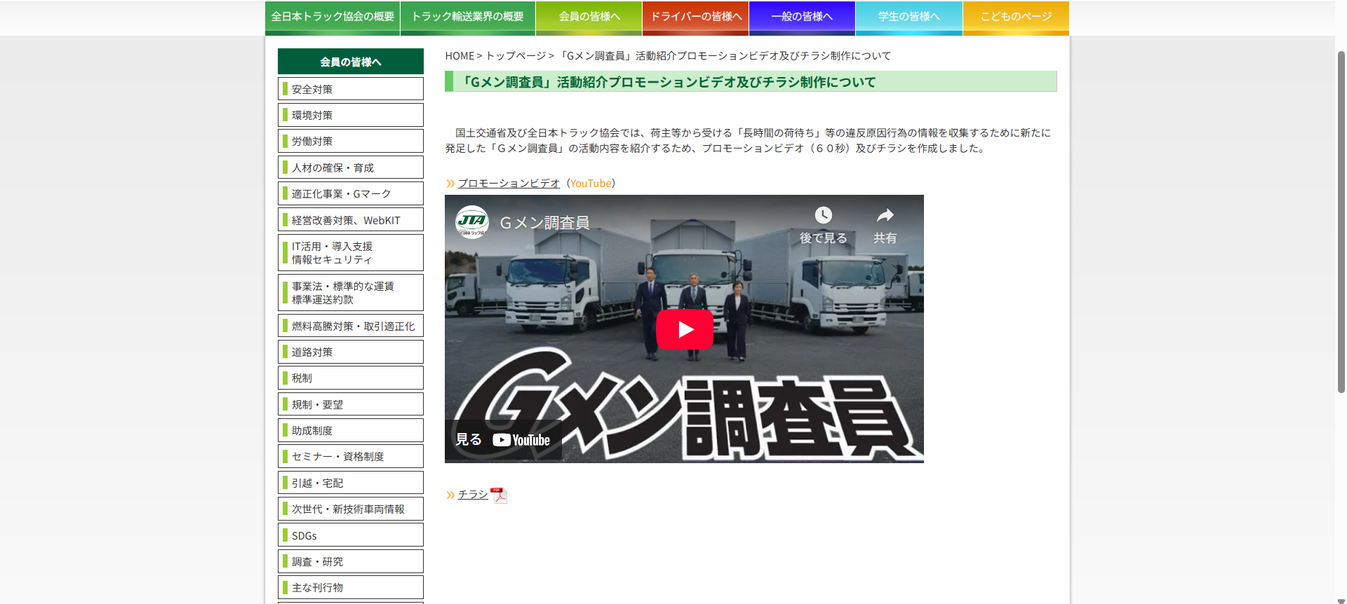 60秒の短い動画ながら、その出来栄えとドラマチックな演出が記憶に残る。まるでヒーロー戦隊モノを見ているようなオープニングはぜひ見てほしい。さらに、国土交通省のトラック・物流Gメンがどんな活動をしているのかがわかりやすく説明されている点にも注目してほしい。