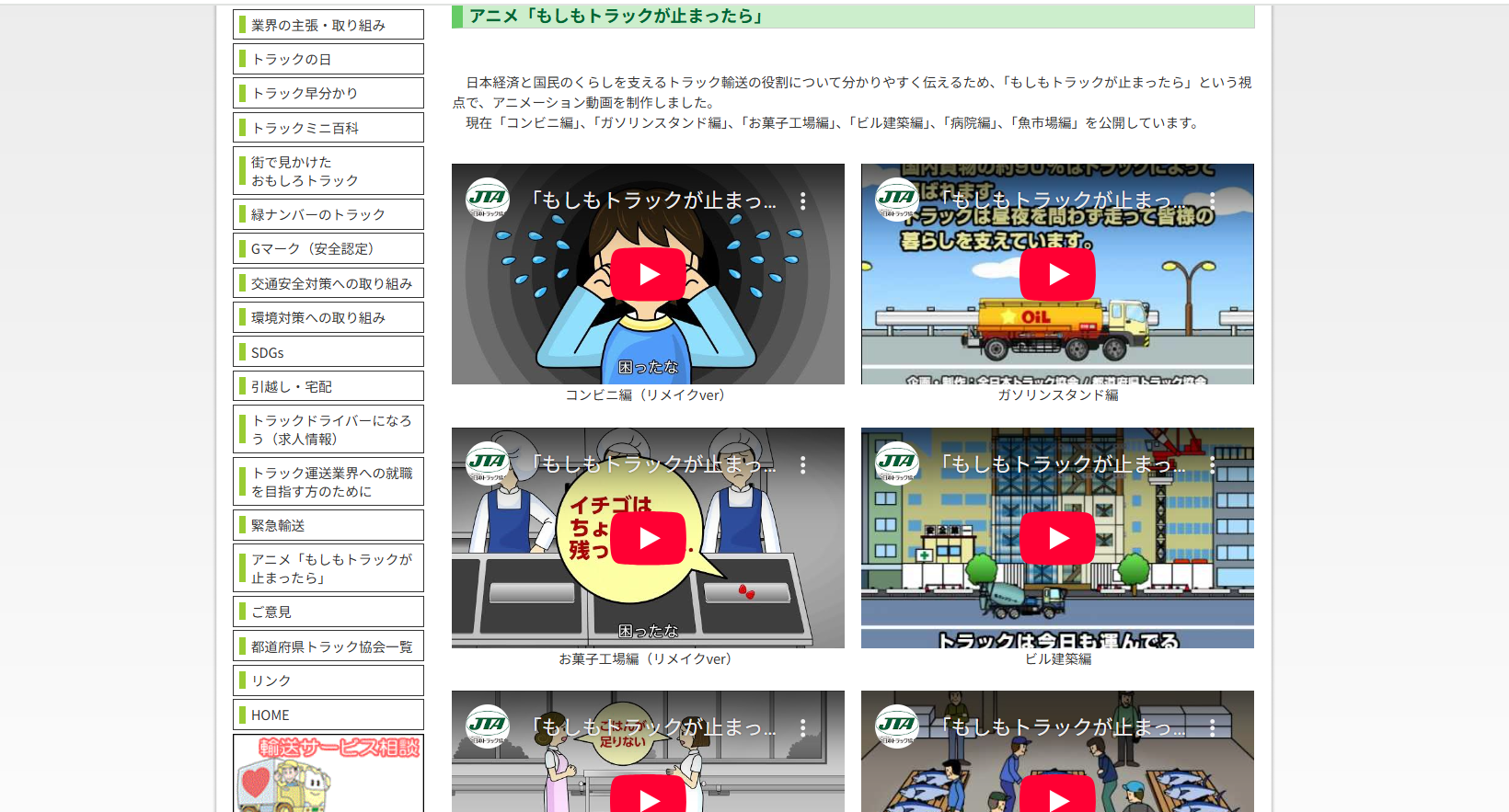 筆者的にもっとも刺さったのが「もしもトラックが止まったら」というアニメシリーズ。絵はもちろんだが、業界別に歌詞が変わっているのだ。ほのぼのとしたテンポで始まる歌で、トラックが来ないとどうなるかを説明してくれている。現在公開されている業界は6つだが、ぜひほかの業界のバージョンも見てみたい。