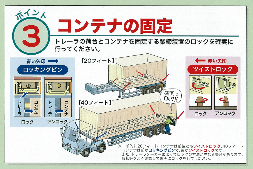 これらのロックをしっかりと固定していないとトレーラーからコンテナが落下したり、カーブの途中でトレーラーが横転するなど重大な事故の原因となります。