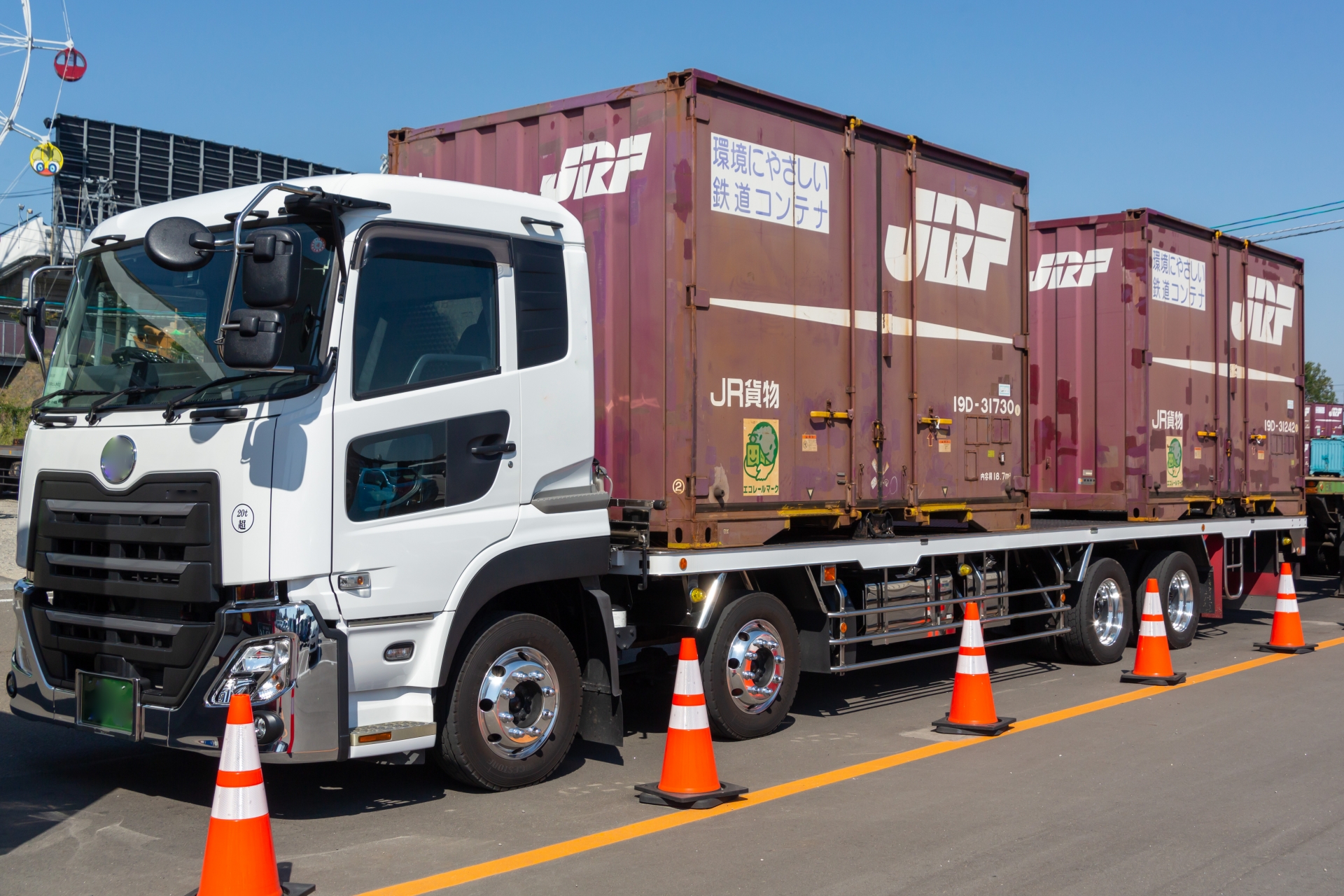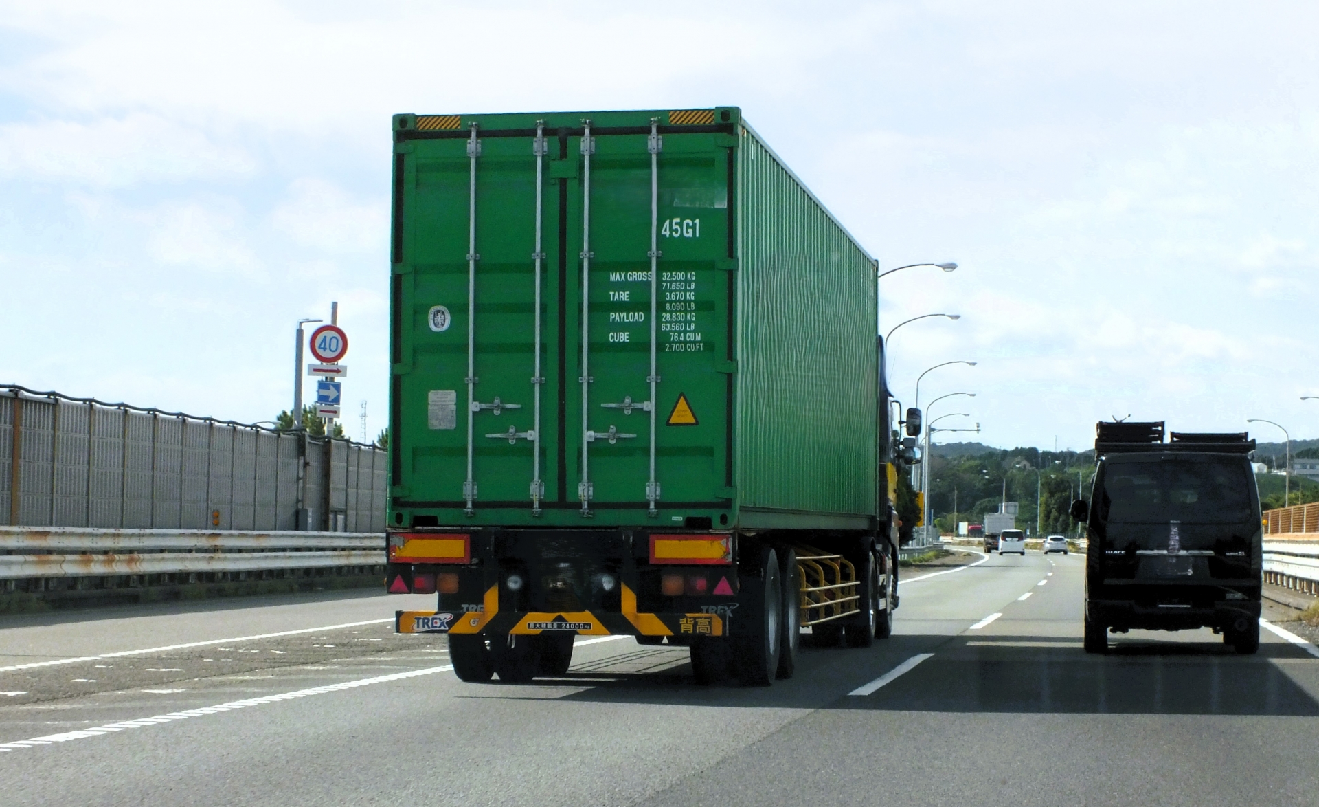 ここまで聞くとなんとなくその姿が思い浮かんだのではないでしょうか。そう、一般道でもよく見かけるコンテナを積んだトラックです。