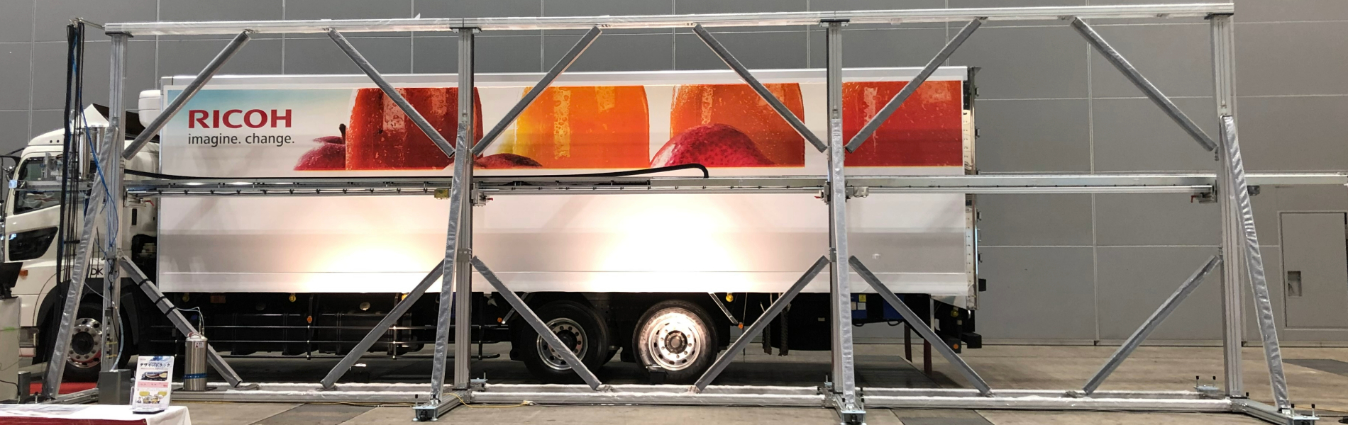 オートボディプリンターは自動でいろいろなでデザインを表現していくマシンであり、デザインできるのはトラックだけでなく、シャッターやブロック、コンクリートなどの建築資材にも使うことができる。また去には航空機エアバスの垂直尾翼やビル全体への塗装実績もあり、高い汎用性も大きな特徴である。