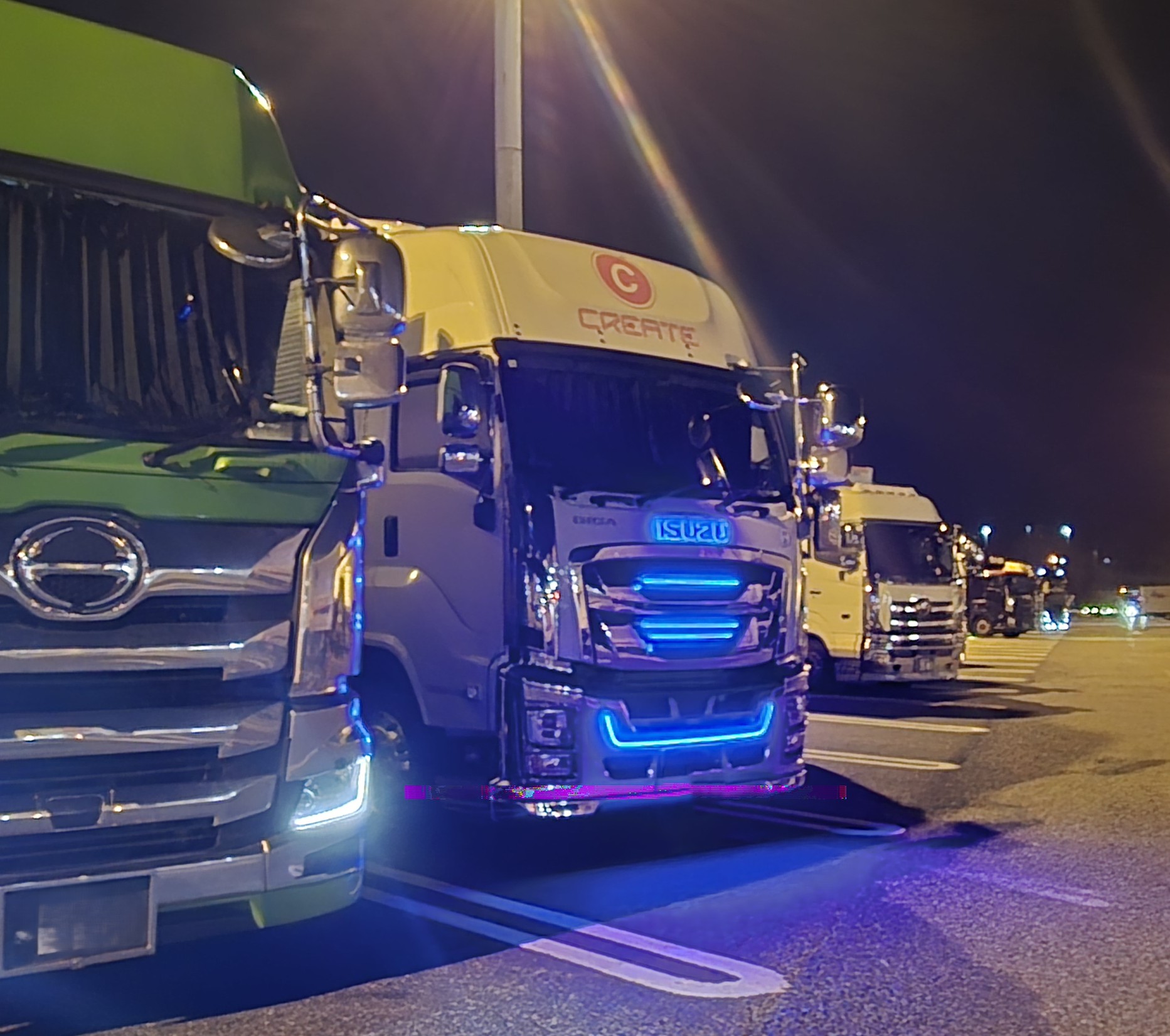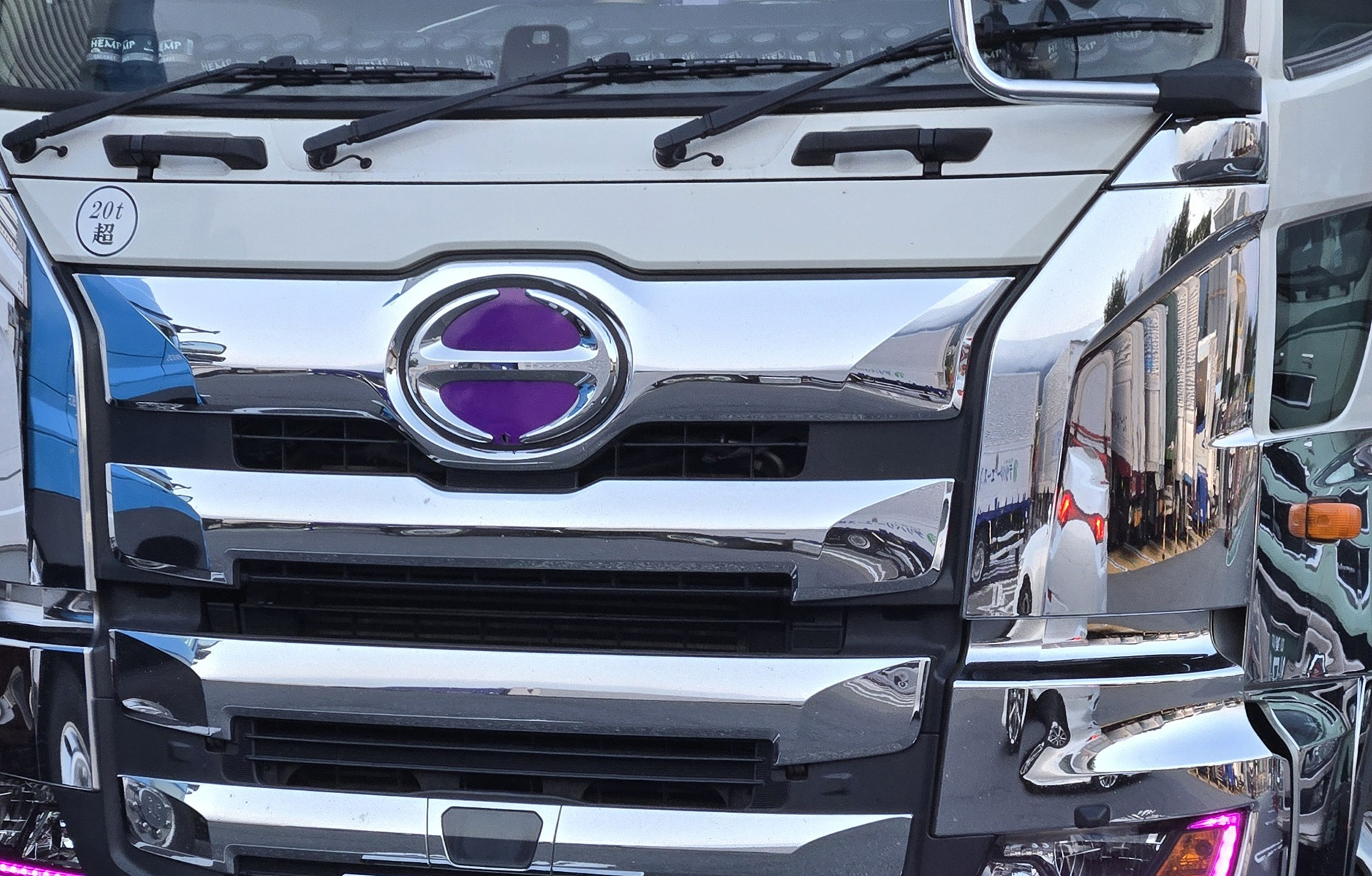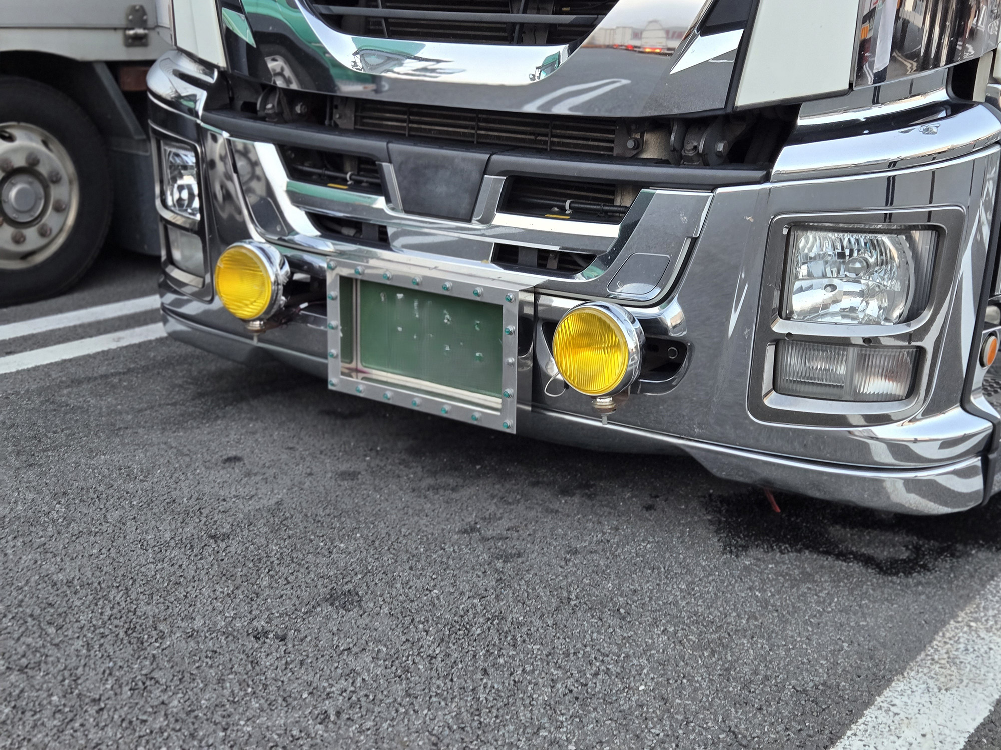 もうこれは確信犯的にレトロ感を演出しているイエローフォグ。ボディが旧めのトラックにはもちろんマッチするが、新しめのトラックに丸いフォグランプという組み合わせは、フロントの迫力が一気に高まる。トラックドライバーの間で定番だとしたら、技ありのセンスの良さに感動する。