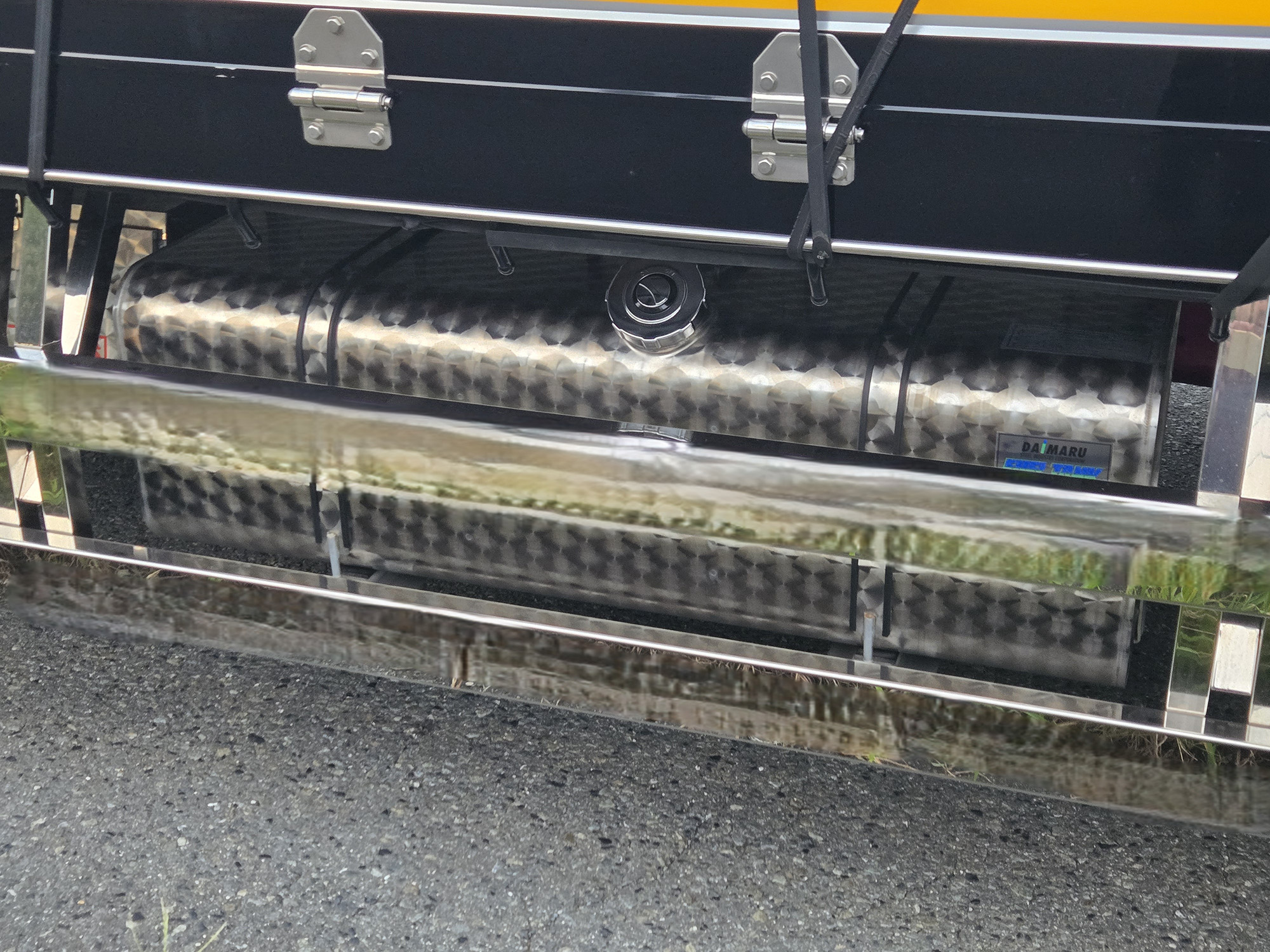 さりげないおしゃれというには存在感がありすぎる燃料タンク。デコトラの世界では定番のウロコステンレス仕様だ。搭載していたトラックもピカピカだったので、きっとドライバーは細部にまでこだわってカスタムするタイプなのだろうと、想像してみた。