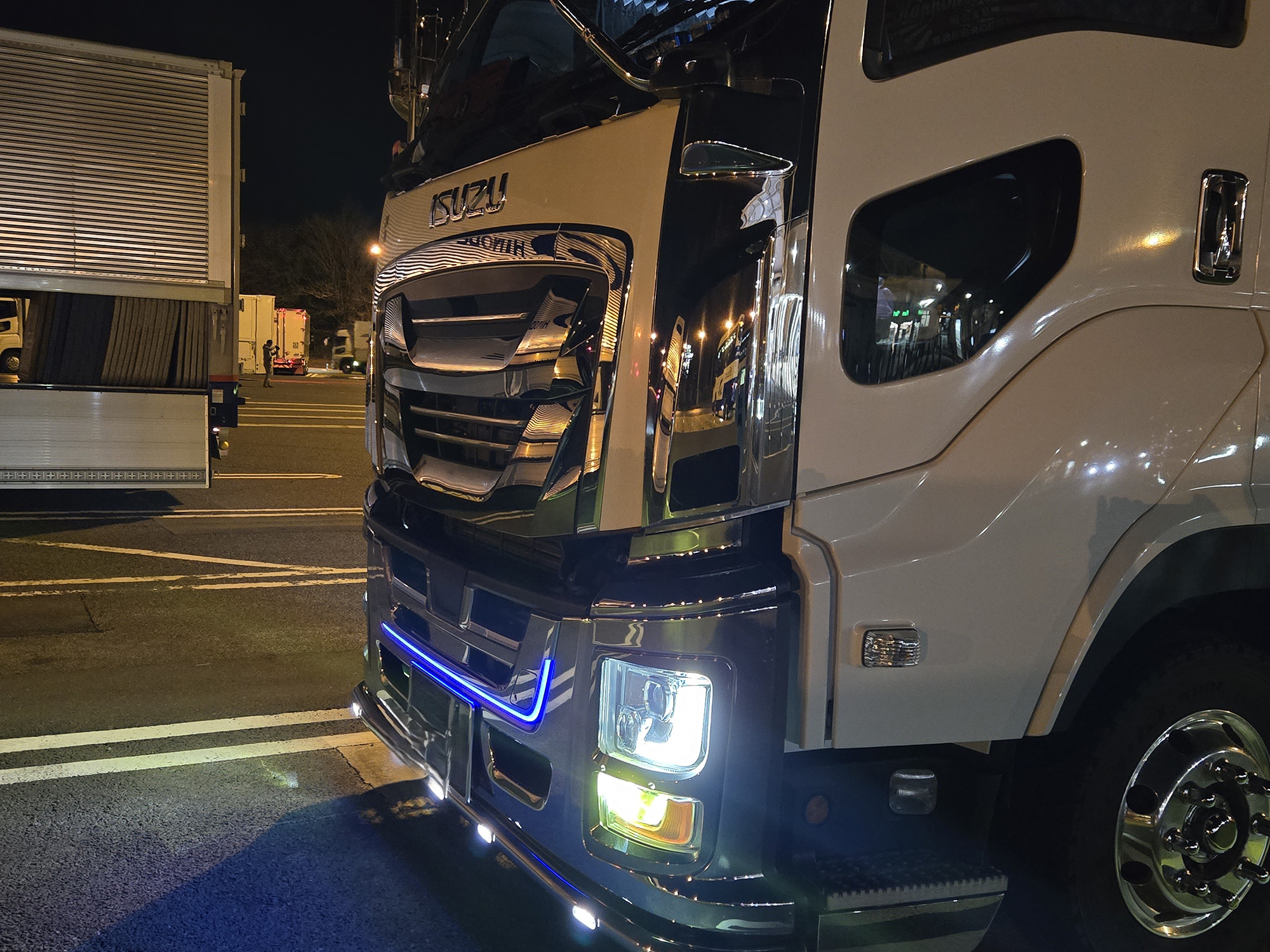 こちらはリップスポイラーに装着された白色ライト。ドレスアップというよりは、視認性向上に役立つ灯火という意味合いが強いが、このシャープな感じがトラックの存在感を引き立たせている。